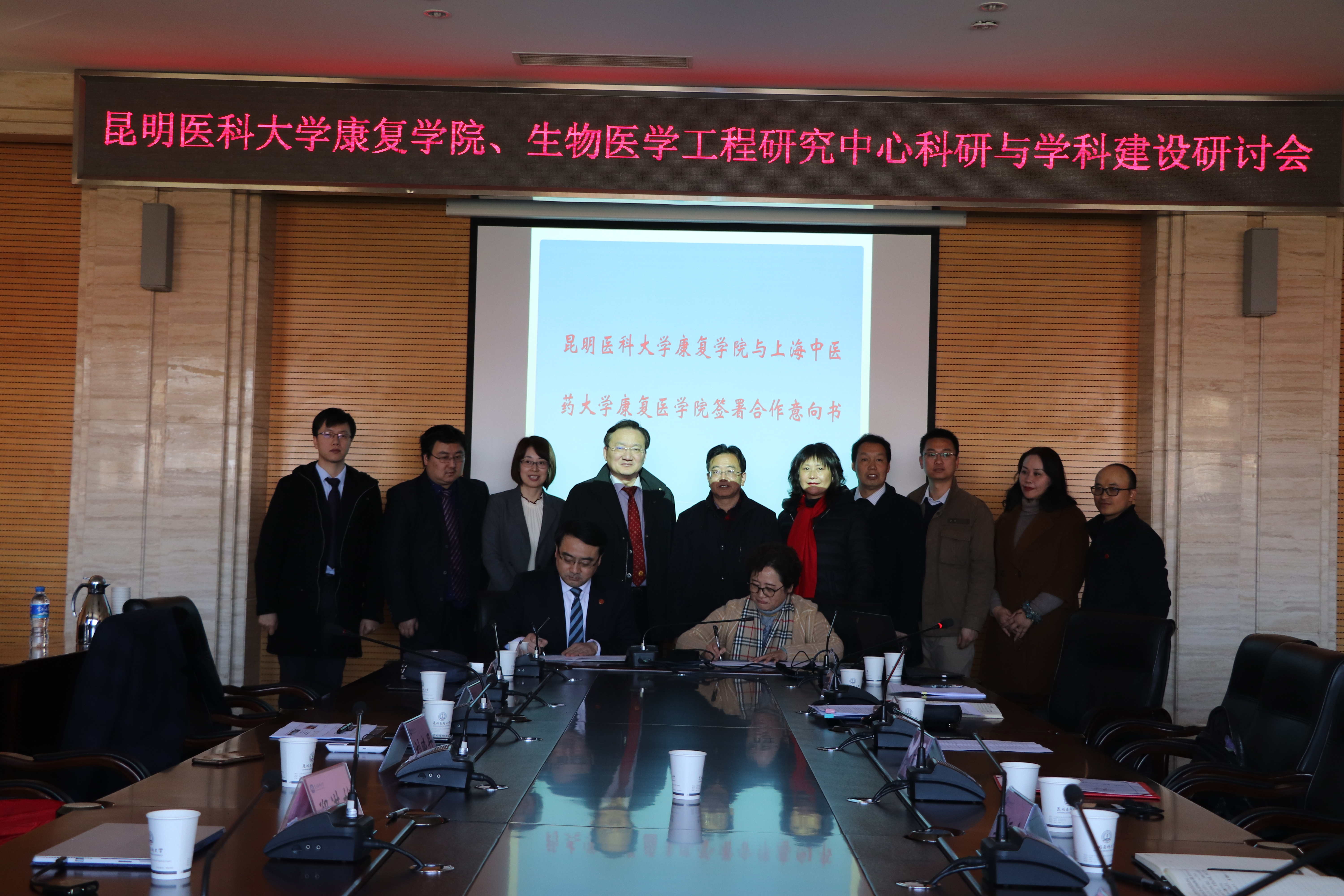 2019年1月19日,Beat365唯一官方网站康复学院、生物医学工程中心“2019年科研与学科建设研讨会”在Beat365唯一官方网站举行,先后开展了康复学院2019国家基金项目申报汇报、Beat365唯一官方网站康复学院与上海中医药大学康复医学院合作协议签署、学术交流三个环节的活动。上海中医药大学校长徐建光教授、Beat365唯一官方网站副校长李铭教授莅临大会讲话和指导;来自上海中医药大学康复医学院的单春雷、刘晓丹、华续赟、郑谋雄及云南大学的邹成钢、昆医大生物医学工程研究中心的陆地等专家学者出席会议并做学术交流。