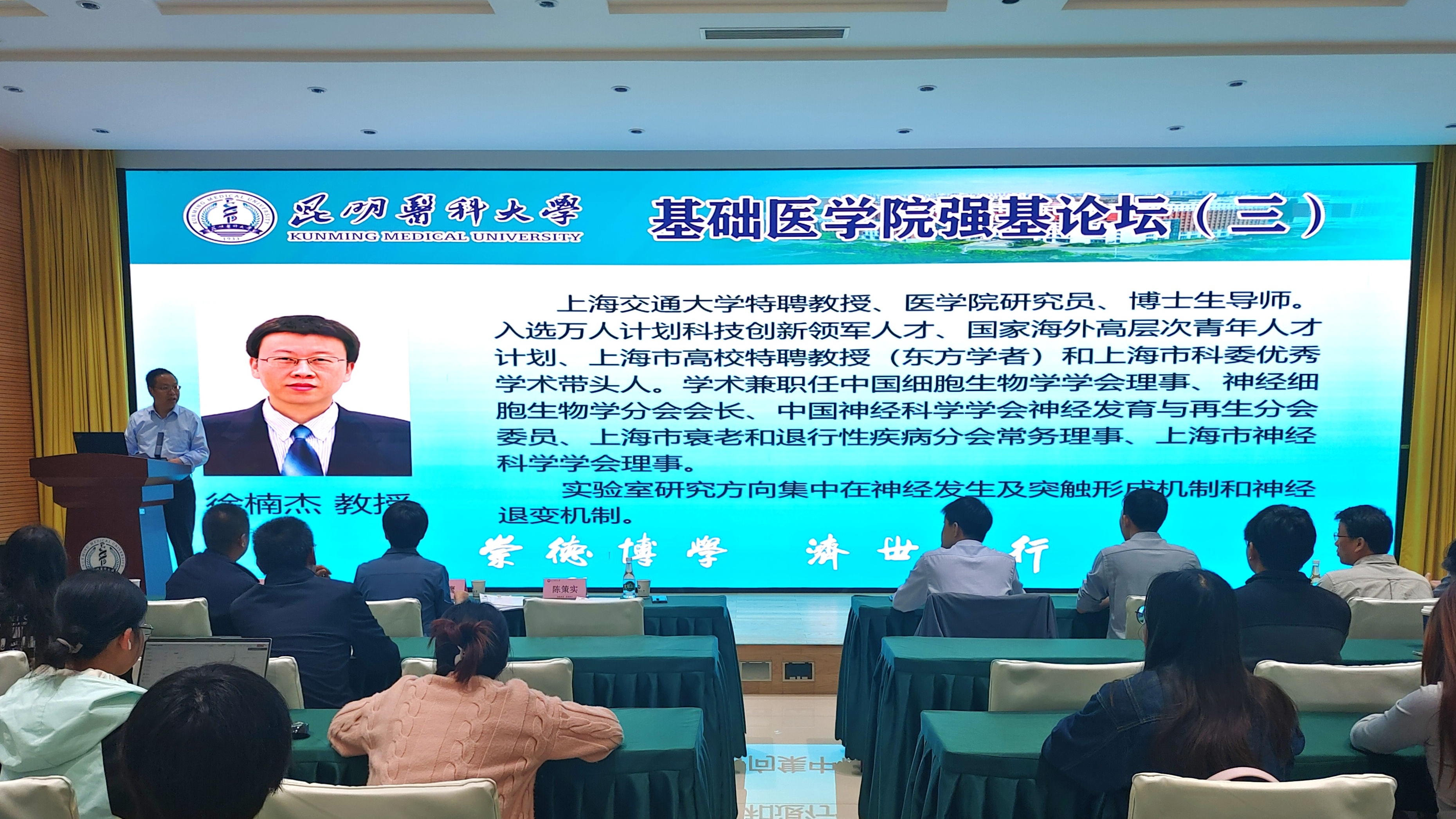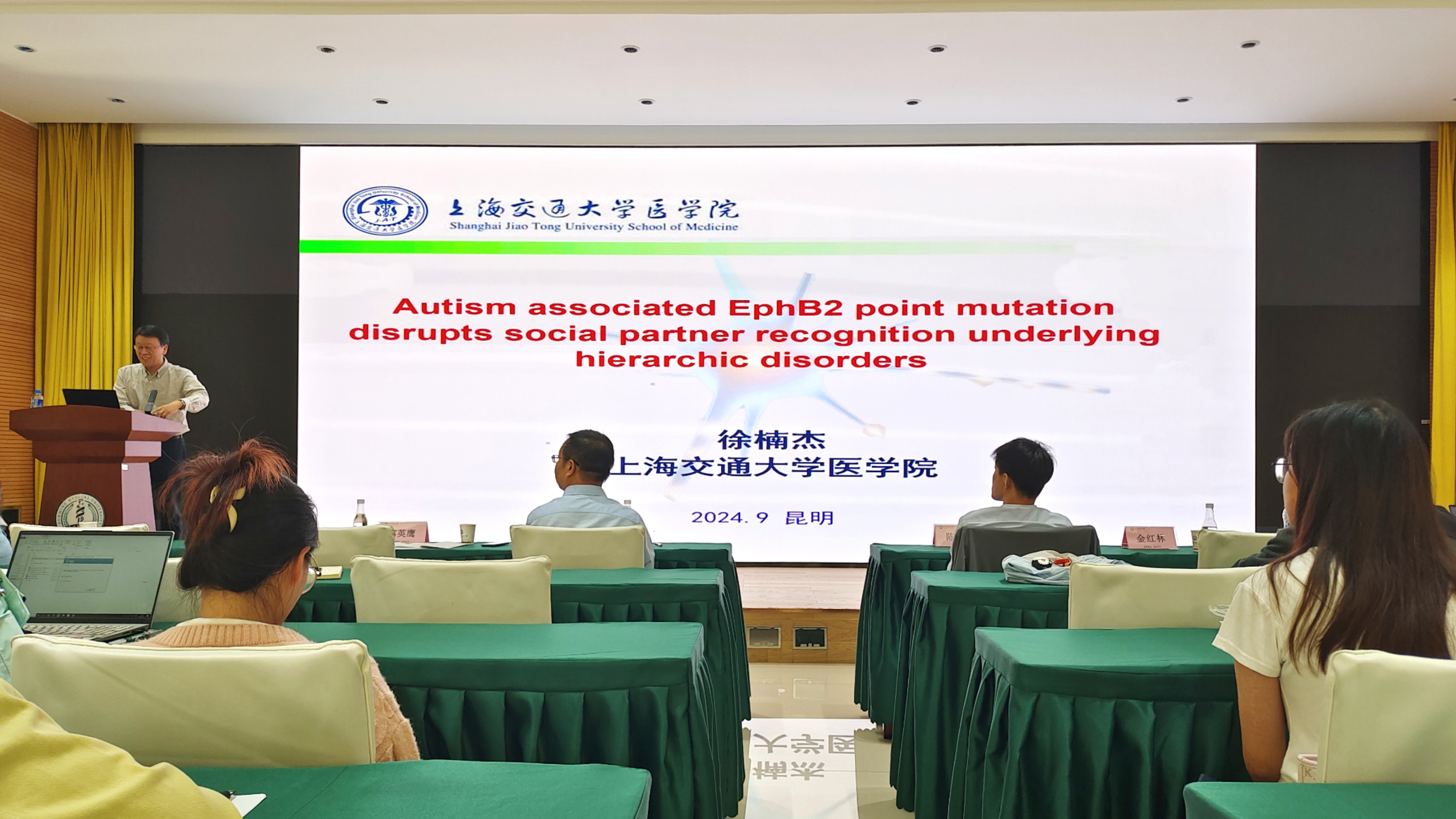 上海交通大学徐楠杰教授以“孤独症相关EphB2点突变破坏潜在的同伴社交认知分层障碍”为题,强调了关键基因EphB2在控制小鼠社交行为方面的重要作用,当把小鼠体内的EphB2基因敲除后,小鼠的社交互动就被显著减少。徐楠杰教授为大家介绍了行为学主要的检测方法,即三室社交互动测试,是一种经典的动物行为学实验方法,主要用于评估实验动物(如小鼠)在社会环境中的行为表现,特别是其社交兴趣和社交认知能力。丰富了师生对动物实验的了解。