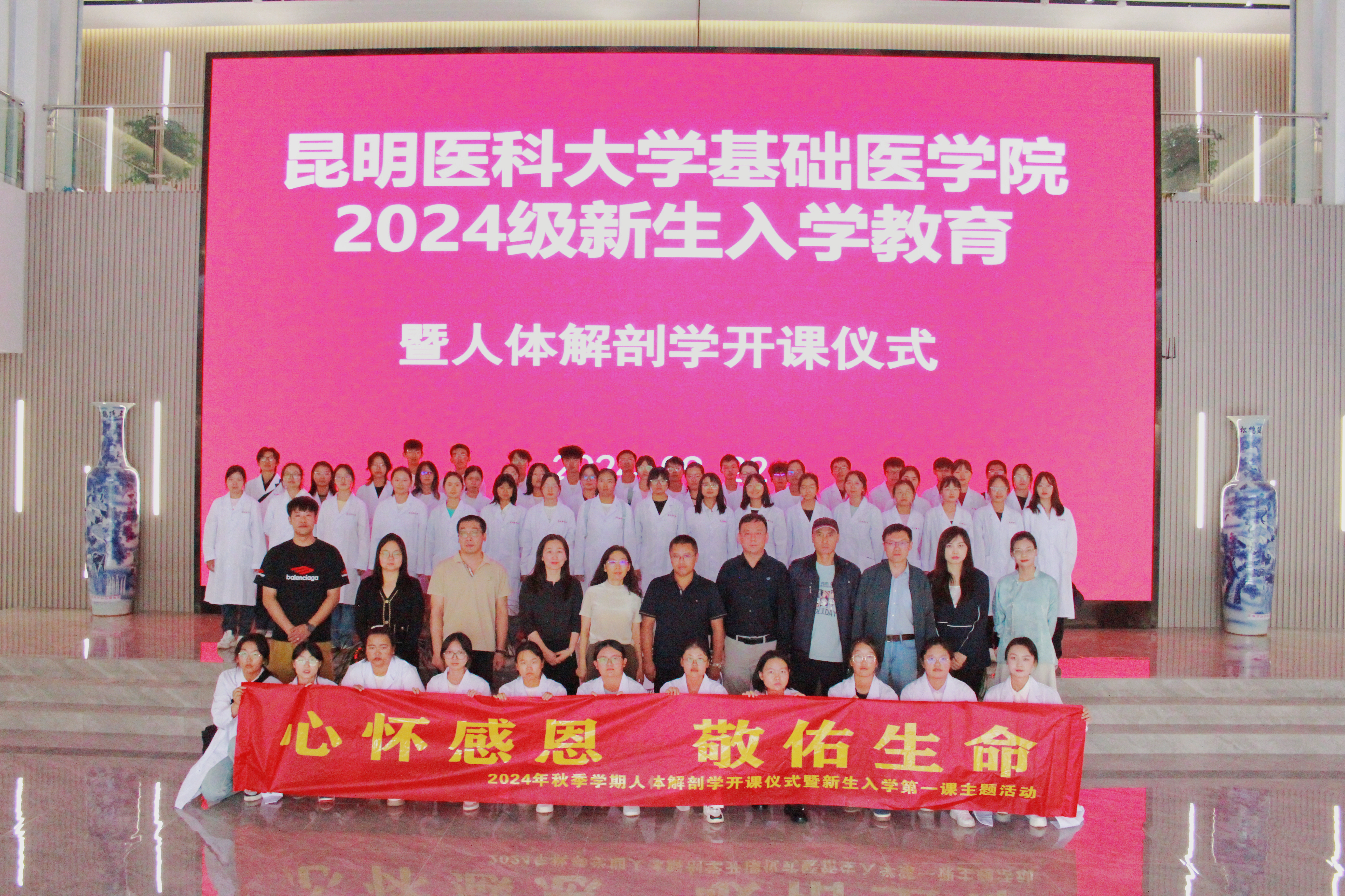 2024年9月22日下午13时,Beat365唯一官方网站基础医学院2024级新生入学教育暨人体解剖学开课仪式在人体科学馆成功举行。学院副院长杨新旺、学生工作办公室主任杨青青、人体解剖学与组织胚胎学系、人体解剖学实验室教师代表及2024级新生代表出席仪式,仪式由人体解剖学实验室主任于洋主持。
