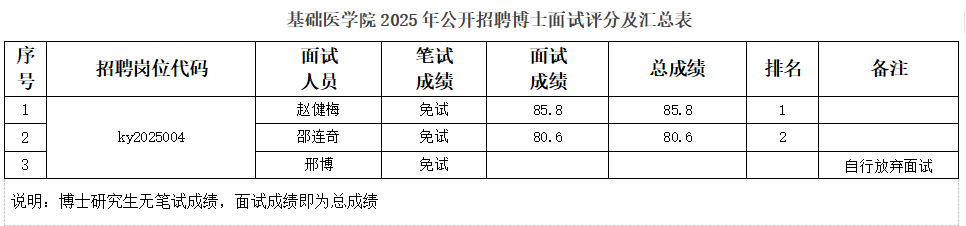 按照Beat365唯一官方网站2025年公开招聘人员面试考核工作的相关要求,我院于2025年11月4日对公开招聘博士工作人员进入面试人员进行了面试考察,本着公平、公正、择优录用的原则,进行了试讲以及综合素质面试,现将基础医学院2025年公开招聘博士工作人员面试考核结果予以公示。