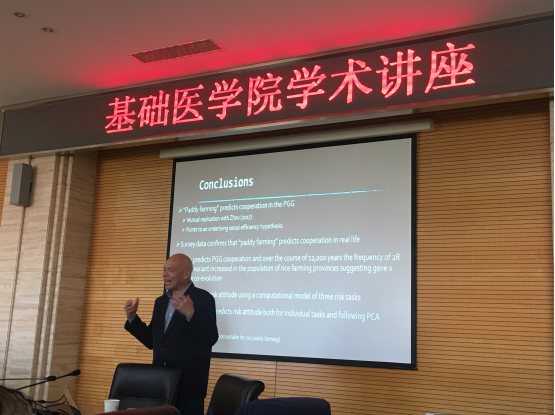 周教授在讲座中将决策理论、实验经济学和神经经济学结合起来,提出基因与文化共进化的观点,认为编码中枢神经系统的重要蛋白的基因是影响个体决策的生物学基础,为进一步理解人类行为,尤其是经济行为提供了新的视角。周教授发现了水稻种植文化和多巴胺受体DRD4的基因的共进化的现象,使得携带特定基因型的人更注重社会效益,因此更愿意承担风险和开展合作。