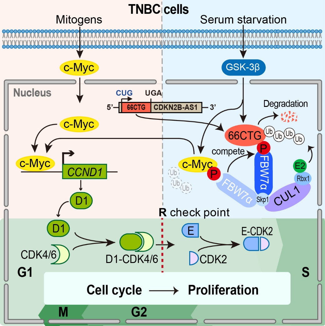 图1. 66CTG小肽稳定c-Myc而加速癌细胞周期进程的机制图。在有丝分裂原刺激下,c-Myc增强Cyclin D1转录表达而促进细胞通过G1期R检查点。当细胞经血清饥饿发生G1期阻滞时,c-Myc因被GSK-3β磷酸化而被FBW7α识别,随后经泛素化-蛋白酶体途径降解。在三阴性乳腺癌中,因66CTG高表达,在G1期末或G1期阻滞阶段,能与c-Myc竞争FBW7α,通过自身降解而稳定c-Myc蛋白,进而帮助癌细胞通过R检查点,加速细胞周期进程,促进癌细胞增殖。