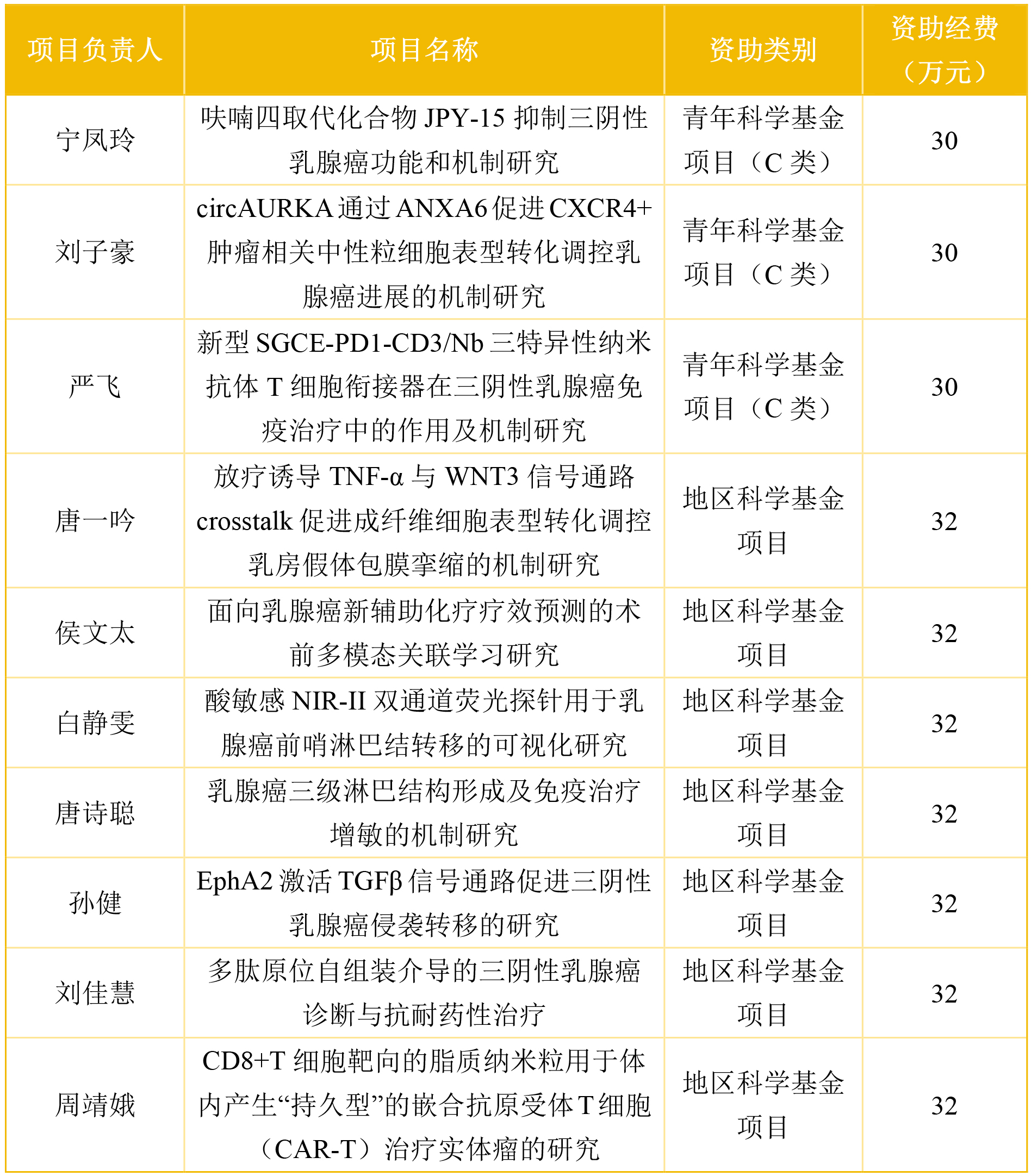 在此次获批的基金中,获得青年科学基金项目(C类)的有宁凤玲、刘子豪、严飞,青年科研人员作为科研队伍的新生力量,为实验室带来全新活力与创新思路,他们将在各自聚焦的乳腺癌研究方向上积极探索,凭借敏锐的科研视角与饱满的研究热情,助力乳腺癌领域研究的持续推进与突破。唐一吟、侯文太、白静雯、唐诗聪、孙健、刘佳慧、周靖娥则顺利获得地区科学基金项目。他们将围绕乳腺癌相关核心课题展开深度研究,有望在乳腺癌发病机制解析、诊断技术优化、治疗方案创新等关键领域取得新进展,为乳腺癌防治研究提供重要支撑。其中唐诗聪和周靖娥是第二次获得国自然基金资助。