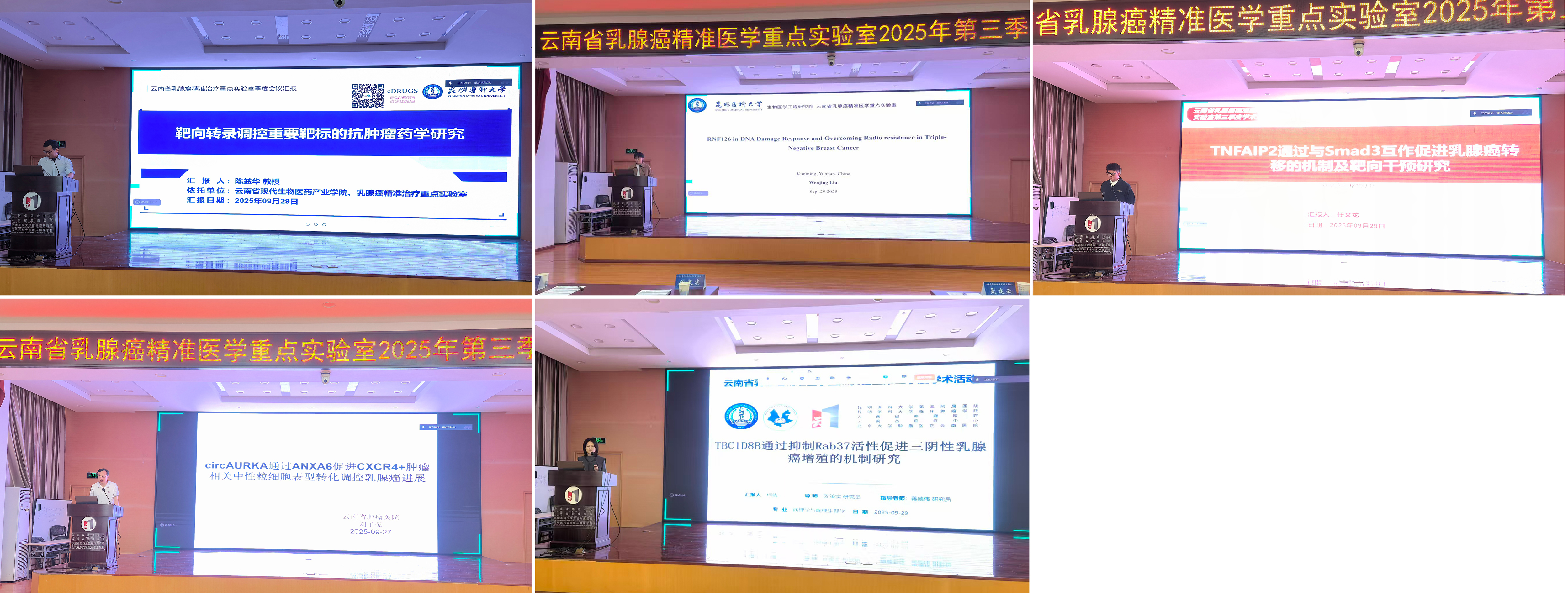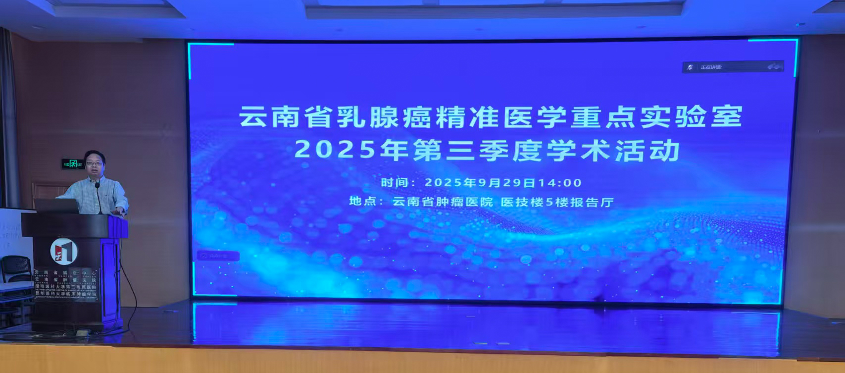 2025年9月29日,云南省乳腺癌精准医学重点实验室在云南省肿瘤医院医技楼5楼报告厅成功举办了2025年第三季度学术活动。重点实验室主任陈策实、副主任李富兵、黄胜,实验室各研究方向负责人,科研骨干以及Beat365唯一官方网站和云南省肿瘤医院在读硕博等80余人参与活动。会议开幕式由黄胜副主任主持,陈策实主任致辞,陈策实主任强调重点实验室在第三季度中在学术成果产出以及科研项目获得方面均取得了优异的成绩,鼓励大家再接再厉,弥补不足,持续为重点实验室的建设添砖加瓦。