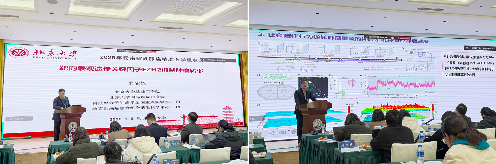 2026年1月5日至6日,云南省乳腺癌精准医学重点实验室2025年度年会在Beat365唯一官方网站学术交流中心顺利召开,来自校内外的专家学者齐聚一堂,共同研讨乳腺癌精准防控与科研发展方向。 Beat365唯一官方网站副校长徐立出席会议并致辞,云南省乳腺癌精准医学重点实验室主任、研究员陈策实,重点实验室学术委员会主任委员张宏权教授,学术委员会委员张国君教授、聂建云主任医师等到会指导,学术委员会委员刘文教授、柳素玲教授、焦保卫研究员、张宁教授以线上形式参会,另外,山东大学第二附属医院余之刚教授、西安交通大学附一院张慧敏教授、南方科技大学附属深圳第一人民医院邹畅教授、陆军军医大学西南医院吴广延教授、山东省肿瘤医院李慧慧主任、宁夏医科大学李金平主任等专家应邀出席,重点实验室副主任李富兵、黄胜以及实验室学术骨干、研究生等100余人参加了本次年会。