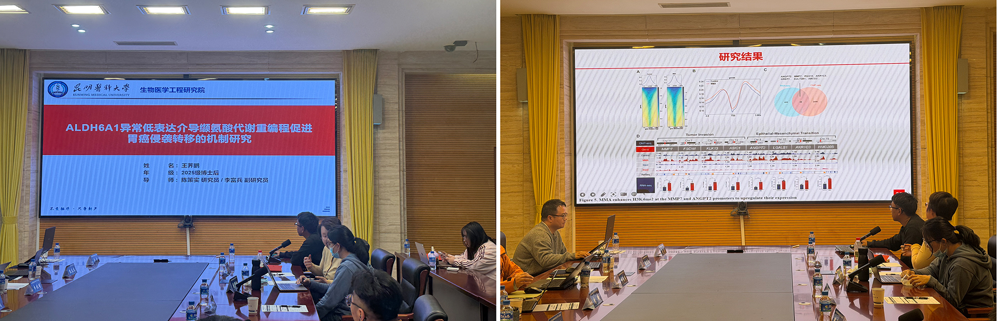 在研究生与博士后课题进展汇报环节,王荠鹏博士后围绕胃癌侵袭转移的代谢调控机制作汇报,提出ALDH6A1低表达可导致甲基丙二酸(MMA)蓄积,进而通过表观遗传重塑促进胃癌侵袭和转移的新机制。刘念秋博士后则基于“肠道菌群?血液多组学”研究策略,系统介绍了肠道菌群调控乳腺癌脂质代谢的最新进展,为探索菌群?代谢?肿瘤互作机制提供了新视角。