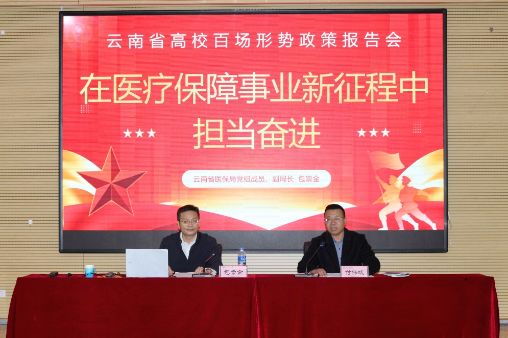 2025年12月12日,云南省医疗保障局党组成员、副局长包崇金一行莅临我校为师生作《在医疗保障事业新征程中担当奋进》专题形势政策报告会,并开展座谈交流。学校党委常委、副校长吴红明参加座谈交流。专题形势政策报告会由校党委常委、宣传部部长付伟斌主持,人文与管理学院师生120余人参加。