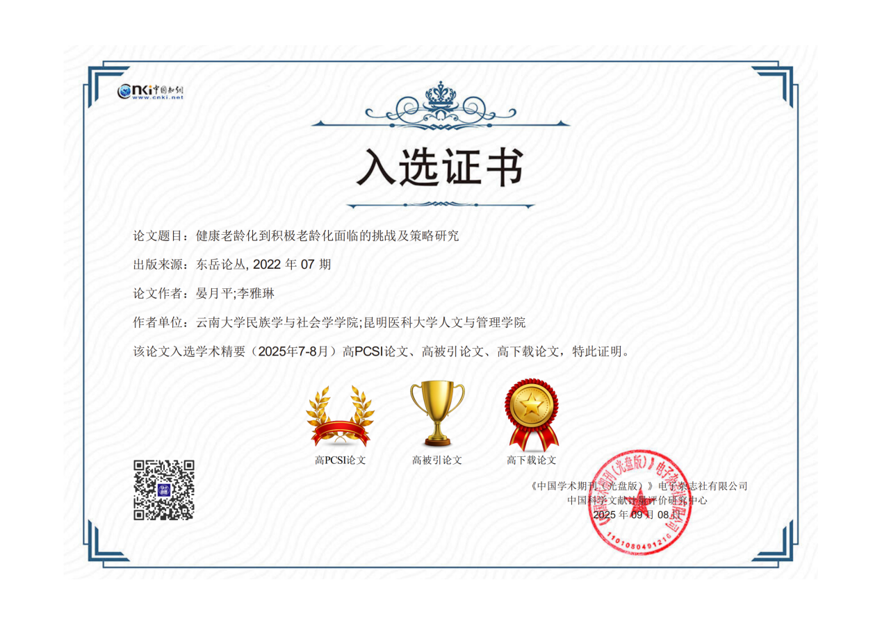 近日,中国知网下属的中国科学文献计量评价研究中心(简称“知网评价中心”)基于中国知网收录的近十年国内学术论文,2024年首次遴选了“中国知网高被引学者”名单,人文与管理学院教师李雅琳入选“2024中国知网高被引学者TOP 5%”。同期,李雅琳作为第二作者发表于东岳论丛2022年07期的论文《健康老龄化到积极老龄化面临的挑战及策略研究》和发表于云南民族大学学报(哲学社会科学版)2022 年04期的论文《独居老人的多维健康脆弱性研究——基于“中国老年健康影响因素跟踪调查”的实证分析》入选学术精要(2025年7-8月)高PCSI论文、高被引论文、高下载论文。