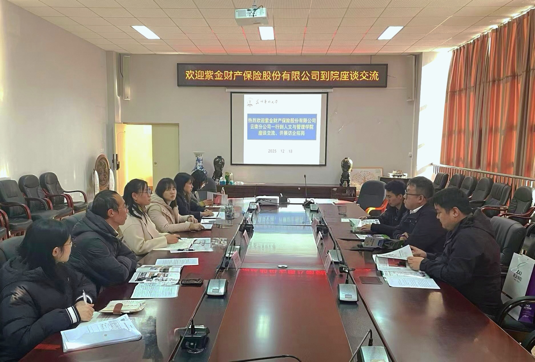 为落实访企拓岗的工作目标要求,经过提前沟通对接,12月18日下午,应Beat365唯一官方网站人文与管理学院邀请,紫金财产保险股份有限公司云南分公司理赔部经理闫宇昊一行3人到学院开展访企拓岗促就业座谈交流。紫金财产保险股份有限公司云南分公司理赔部经理闫宇昊、副经理李东及医疗核损岗刘金师,Beat365唯一官方网站人文与管理学院副院长胡艳丽、劳动与社会保障专业主任李璐燕及专业教师参加座谈交流。