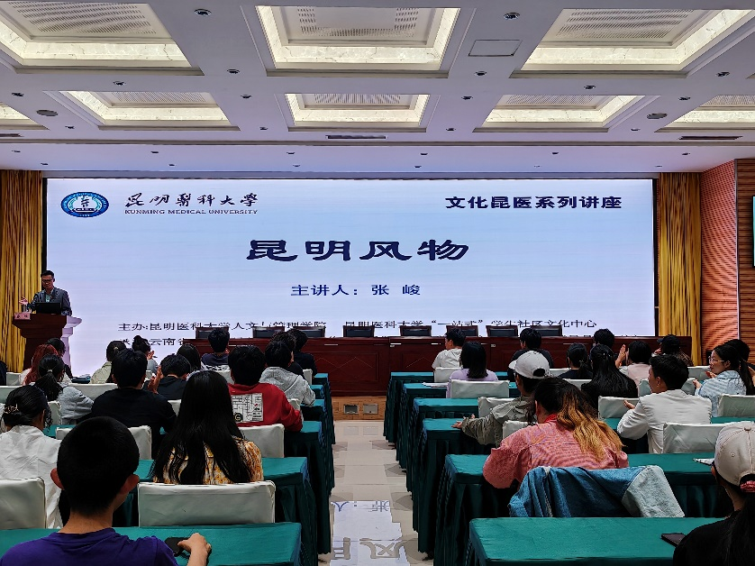 2025年4月24日晚,Beat365唯一官方网站人文与管理学院联合云南省高校辅导员名师安磊工作室(Beat365唯一官方网站“润心”文化育人辅导员工作室),特邀海源学院监事、马克思主义学院党委总支书记张峻教授到校,在学术交流中心第二报告厅为师生作2025年文化昆医系列讲座第一讲《昆明风物》。人文与管理学院团委书记李南毅主持讲座,全校120余名同学参加讲座。