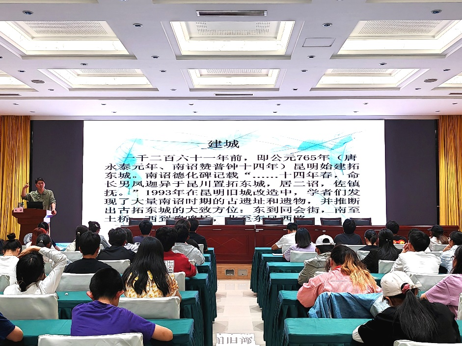首先,张峻老师系统讲述了昆明建城历史,结合大观楼长联和历代昆明城池图展现了昆明独特的区位条件;结合金马碧鸡坊、翠湖与黑龙潭等“昆明八景”详细介绍了昆明的自然与人文景观,妙趣横生地讲述了昆明的方言和历史遗迹、文化地标等知识,让同学们深刻感受到了昆明的文明和印记。
