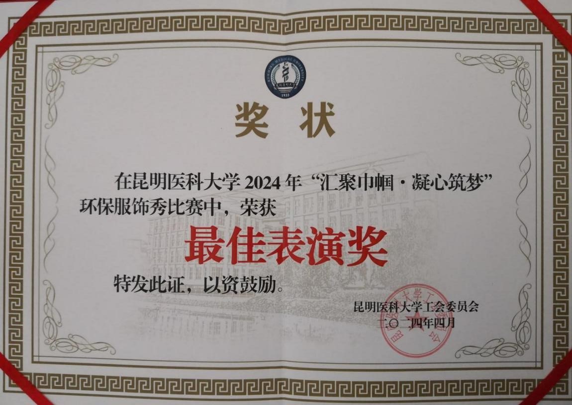 2024年4月26日晚,学校“会聚巾帼·凝心筑梦”环保服饰秀比赛在呈贡校区学生会堂举行。我院节目“绿色家园同心创 巾帼筑梦展霓裳”荣获最佳表演奖。