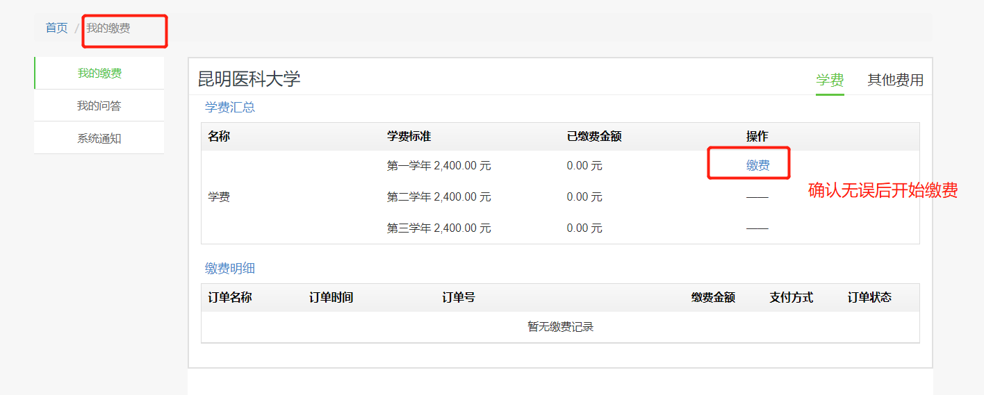 一、电脑端缴费 登录后收到如下缴费短信,点击“我的缴费”进行缴费。