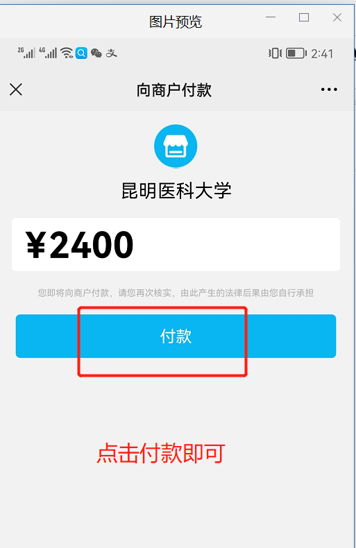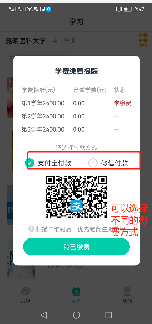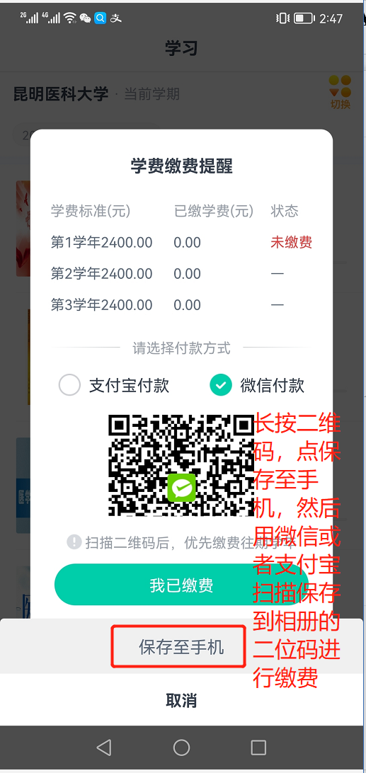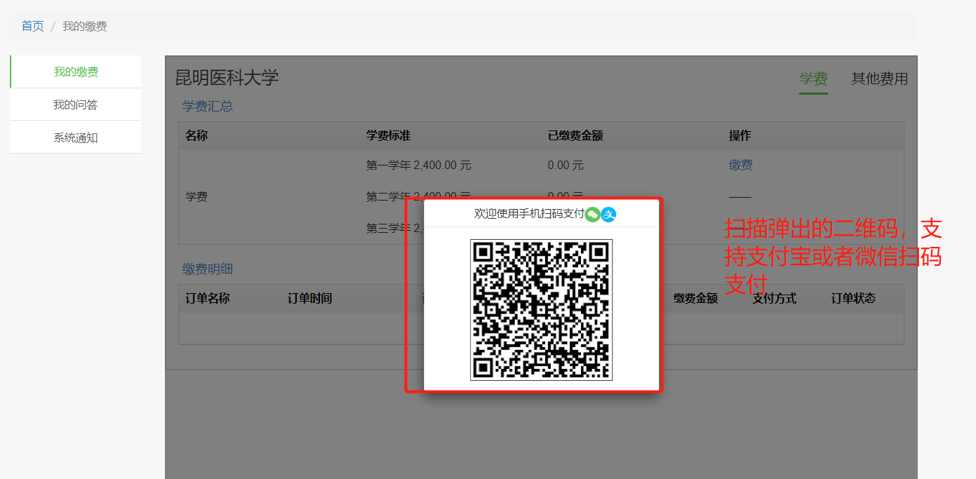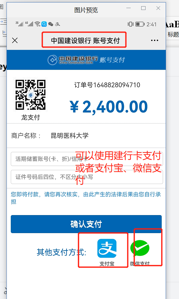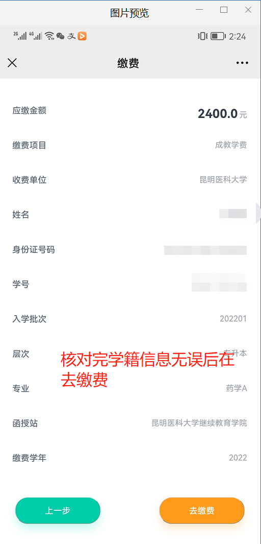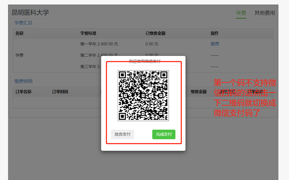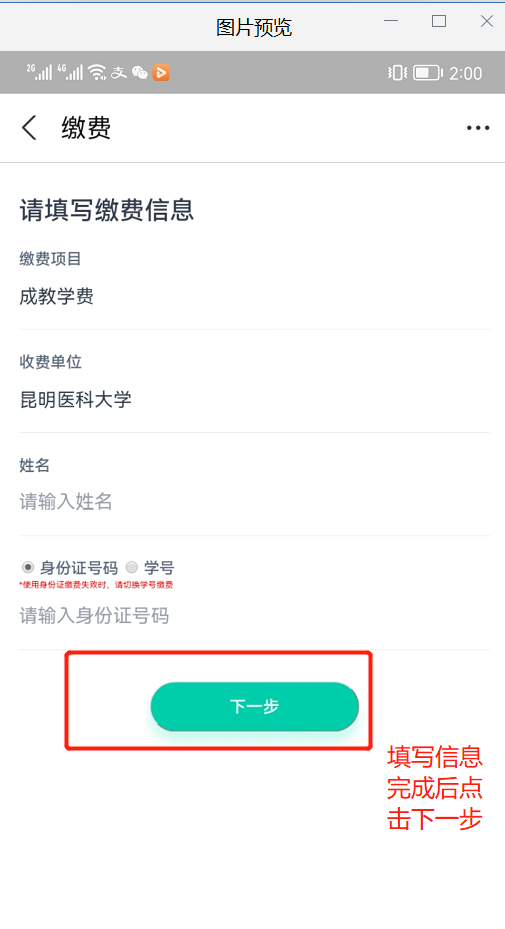 然后用手机扫码后进入支付界面,填写完成信息,身份证缴费失败时请切换学号缴费