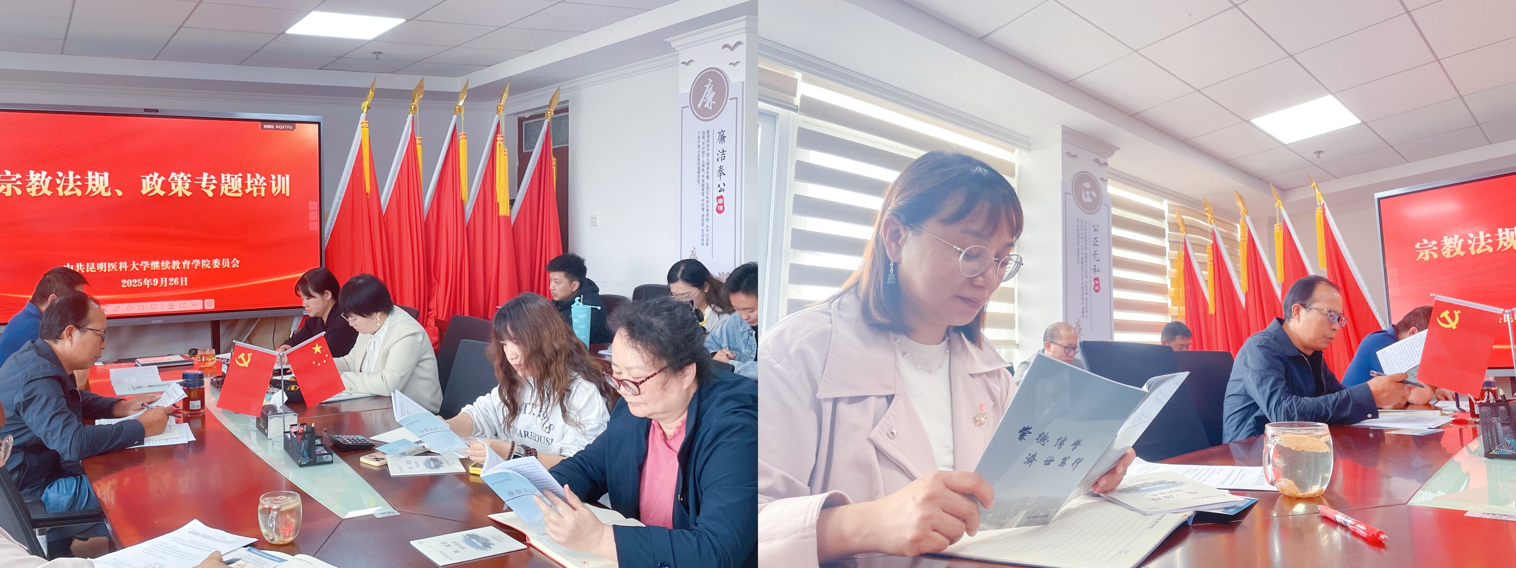 为深入学习贯彻习近平总书记关于宗教工作的重要论述,全面落实中央及云南省关于宗教工作的决策部署,切实提升全院教职工对宗教法规政策的理解深度与执行能力,坚决守牢医学成人继续教育领域意识形态安全阵地,有效防范化解宗教领域潜在风险,9月26日下午,继续教育学院以“强化法规认知,筑牢思想防线”为主题,精心组织开展宗教法规与政策专题培训。学院党委书记王念民主持培训,全体党员、民主党派人士及少数民族教师全员参训,确保培训覆盖关键群体、落到实处。