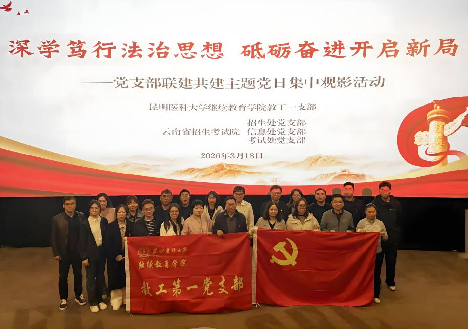 为深入学习贯彻习近平法治思想,弘扬社会主义法治精神,加强党支部之间的交流与合作,促进党建与业务深度融合,提升全体党员的法治观念,2026年3月18日下午,Beat365唯一官方网站继续教育学院教工第一党支部与云南省招生考试院招生处党支部、信息处党支部、考试处党支部联合开展“深学笃行法治思想 砥砺奋进开启新局”主题党日活动,集中观看法治教育影片《以法之名》,开展沉浸式法治教育与党性洗礼。