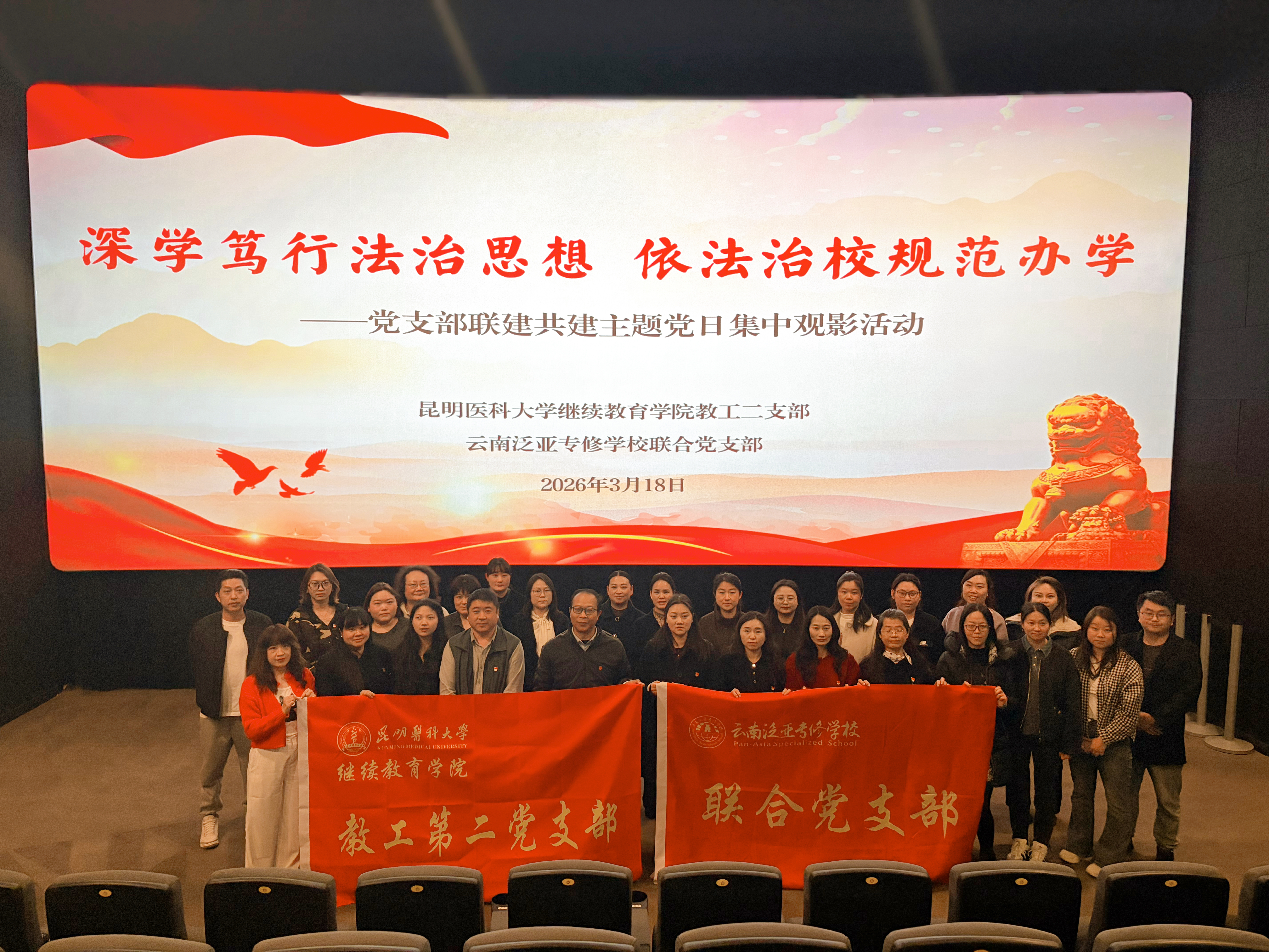 为深入学习贯彻习近平法治思想,全面提升党员法治素养和依法治校规范办学能力,2026 年 3 月 18 日,Beat365唯一官方网站继续教育学院教工第二党支部与云南泛亚专修学校联合党支部联合开展“深学笃行法治思想 依法治校规范办学”联建共建主题党日活动,集中观看法治教育影片《以法之名》。