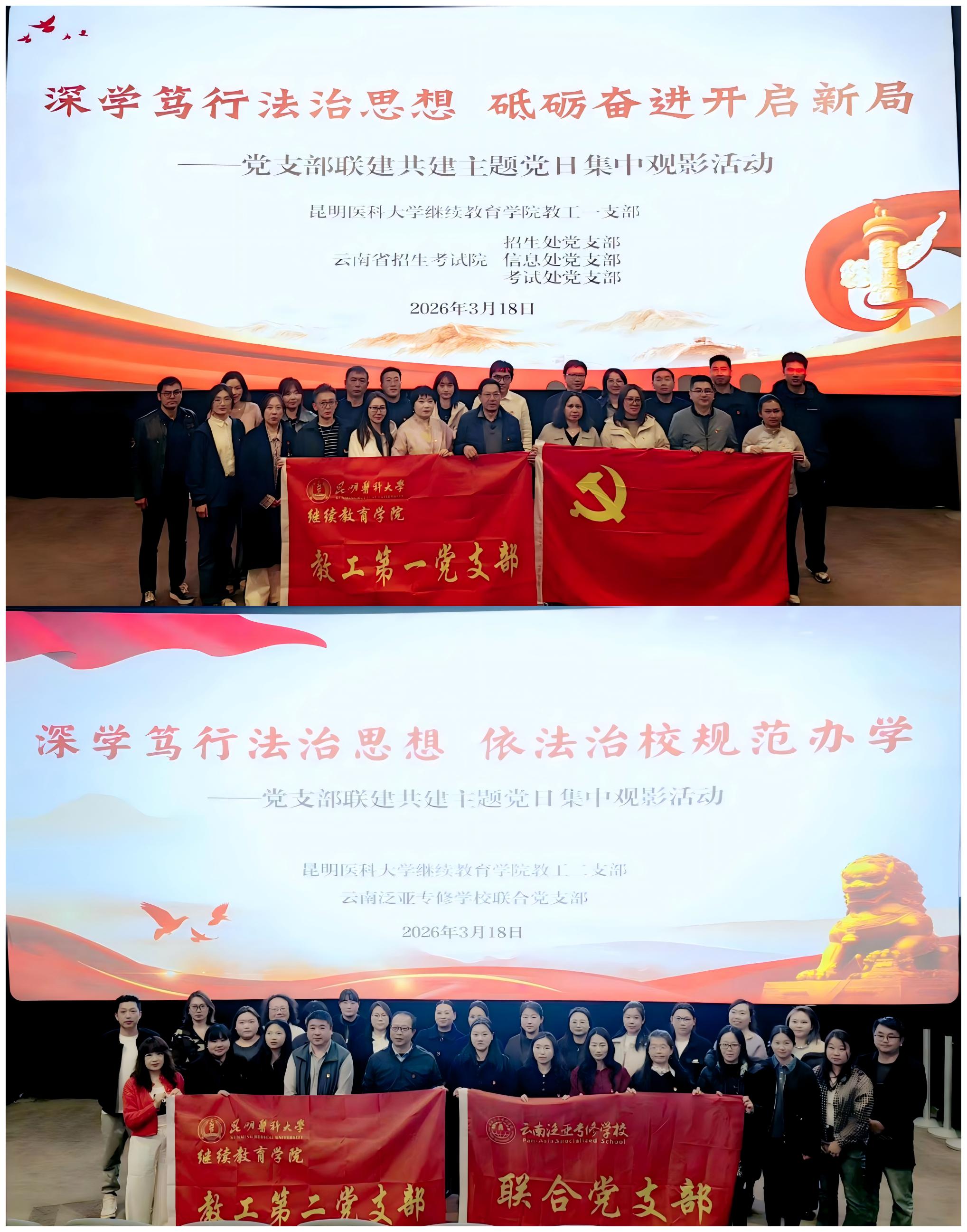 为深入学习贯彻习近平法治思想,全面提升党员法治素养,推动依法治院、规范办学走深走实,促进党建工作与业务工作深度融合,2026年3月18日,学院教工第一、第二党支部,分别与联建共建单位携手开展主题党日活动。全体党员集中观看法治教育影片《以法之名》,沉浸式接受法治教育和深刻党性洗礼。其中,教工第一党支部携手云南省招生考试院招生处党支部、信息处党支部、考试处党支部开展活动,教工第二党支部与校外教学点云南泛亚专修学校联合党支部携手共建、共同参与,还邀请昆明卫生职业学院教学点教师代表参加活动。