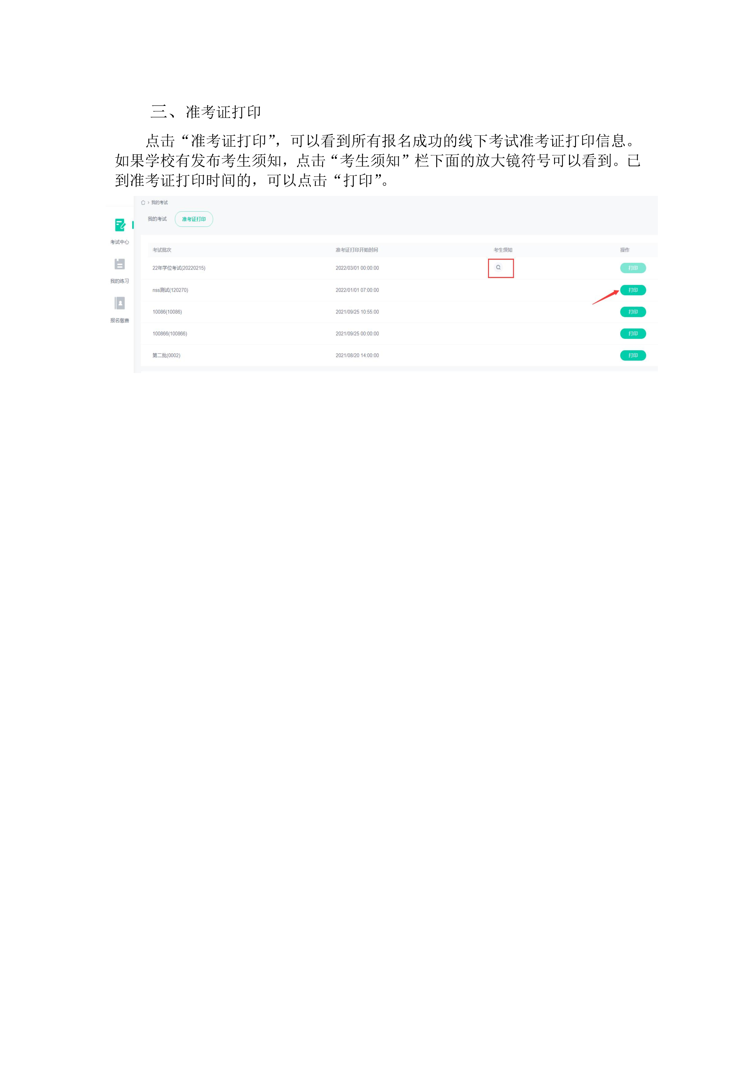 第六步:请报名考生于4月19日后,登录报名系统打印《准考证》(准考证附考点考场信息),注意准考证只能在电脑端查看并打印,手机端不能打印准考证,准考证打印截止时间为开考前30分钟。