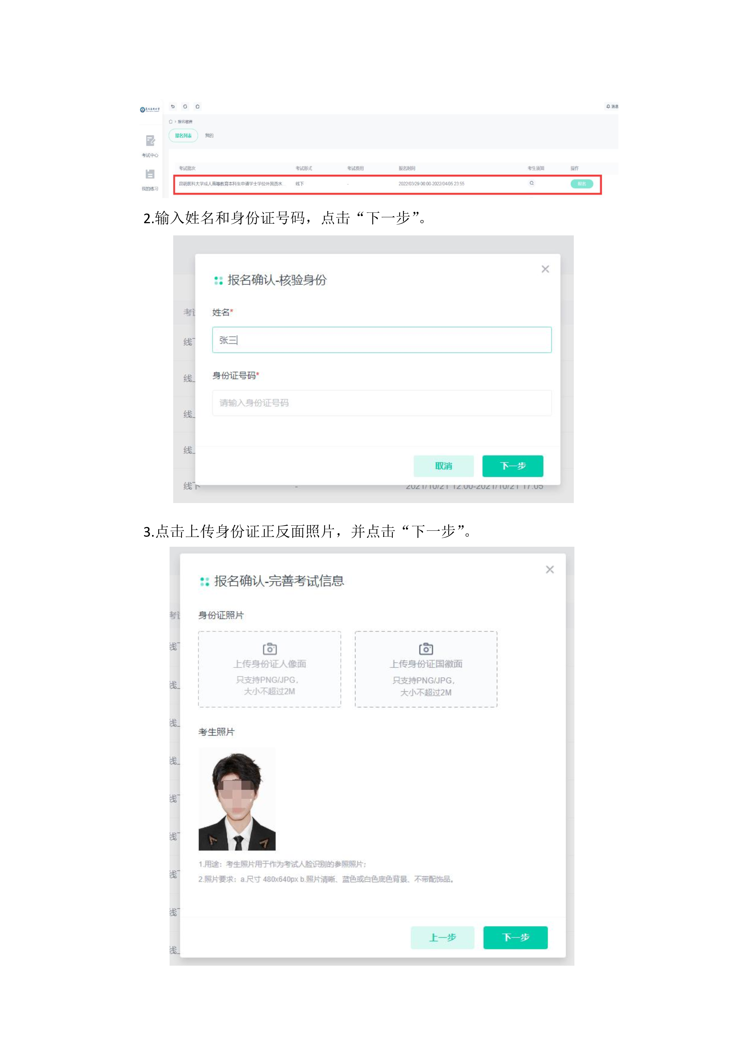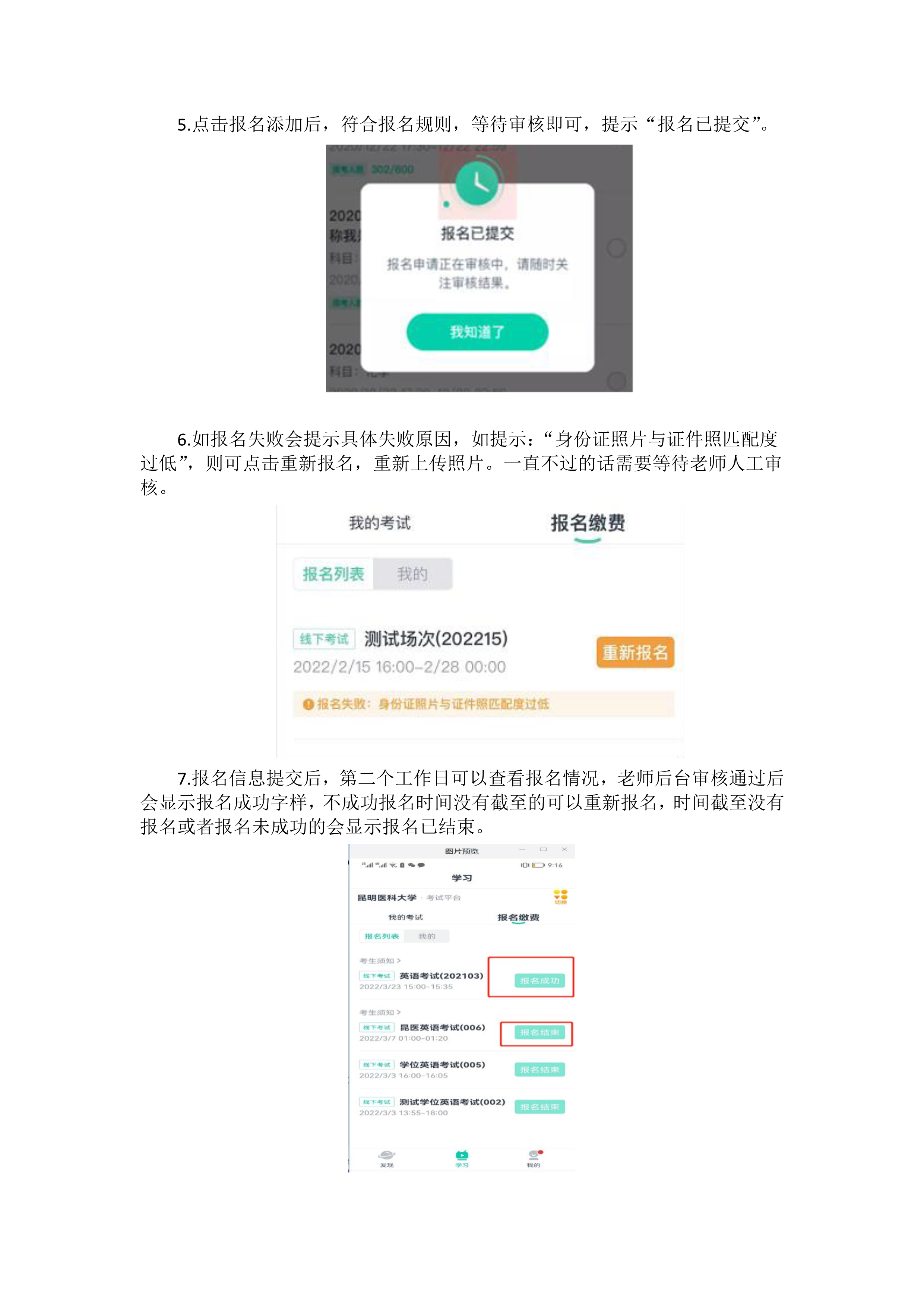 第四步:提交报考信息,点击“提交”按钮等待审核,若此时出现报名失败:身份证照片与证件照匹配度过低,请重新上传照片;若仍提示失败,则需要等待老师后台审核,无需重新报名。