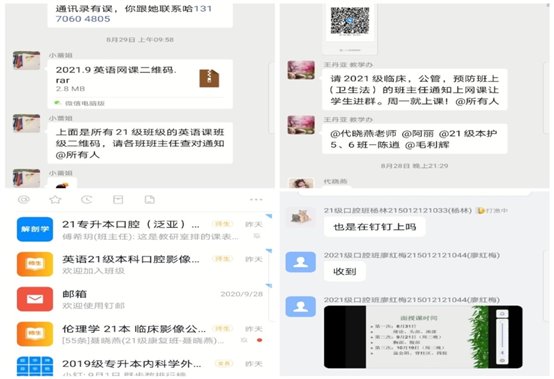 根据新学期教学安排,辅导员通过班级QQ群并通过线上发布课程表、线上教学进群码、教材发放、成绩查询、补考等通知,确保把学院的各项文件要求通知、传达到每一位同学,指导和帮助每一位学生顺利完成学业。 为了保障了线上教学的顺利开展,辅导员积极协助教学管理办公室和任课教师开展线上授课和学习等在线教学活动,通过建好各门课程的QQ群、微信群、钉钉群,指导学生入群进行学习,并协助专业教师规范课堂纪律、与任课老师反馈线上课堂效果,为教学任务的顺利完成保驾护航。