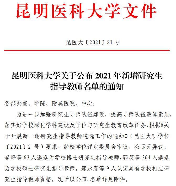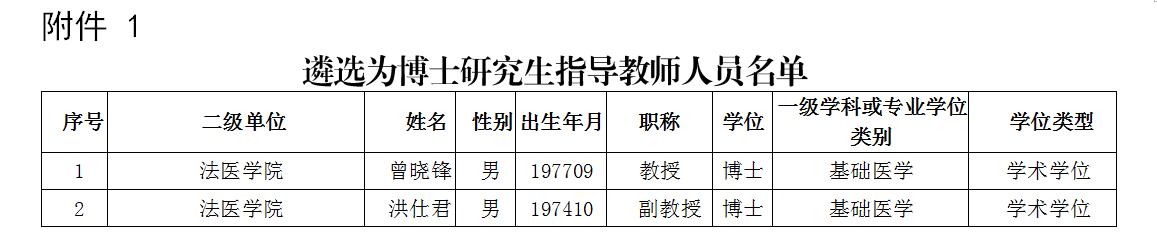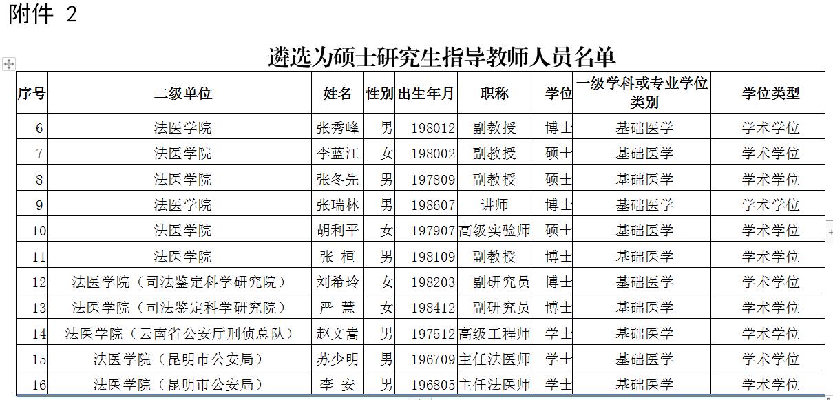 近日,Beat365唯一官方网站开展了新一轮研究生指导教师遴选工作,经校学位评定委员会审议通过,2021年法医学院新增13名研究生导师,包括2名博士生研究生导师、11名硕士研究生导师。其中5名导师分别来自司法鉴定科学研究院、云南省公安厅刑侦总队、昆明市公安局等法医学人才联合培养基地。目前,法医学院共有博士研究生导师6名,硕士研究生导师31名,导师队伍队伍持续扩大,为高级法医学人才培养水平奠定了坚实基础。