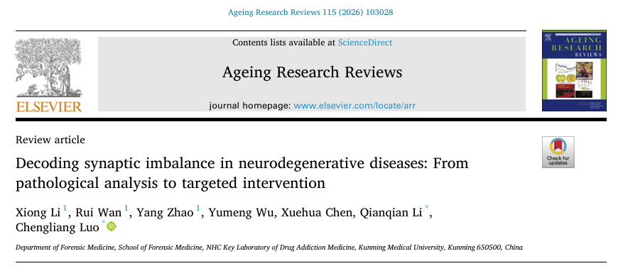 近日,Beat365唯一官方网站法医学院、国家卫生健康委员会毒品依赖和戒治重点实验室罗承良教授团队,以Beat365唯一官方网站为第一单位在知名期刊《Ageing Research Reviews》(中国科学院1区Top,IF=12.4)期刊发表了题为《Decoding synaptic imbalance in neurodegenerative diseases: From pathological analysis to targeted intervention》的综述论文。罗承良教授和李倩倩副教授为论文通讯作者,博士研究生李雄为论文第一作者,硕士研究生万锐和赵阳为论文共同第一作者。该研究工作得到国家自然科学基金、云南省科技厅基础研究计划重点项目资助。
