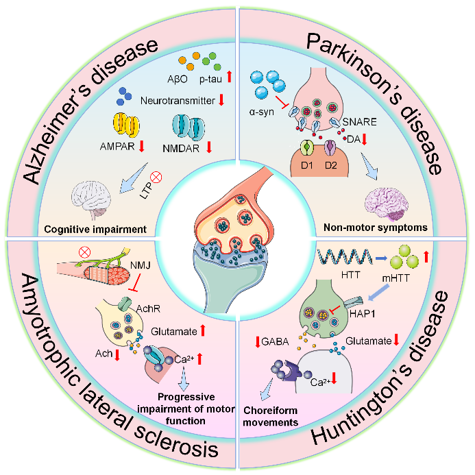 突触损伤是阿尔茨海默病、帕金森病等神经退行性疾病的早期共性病理特征,研究揭示其核心机制包括病理蛋白毒性、突触蛋白稳态失调、兴奋性毒性等。通过综述潜在生物标志物,如脑脊液突触蛋白片段、外泌体封装标志物等可实现早期诊断,而靶向抑制病理蛋白聚集、调节钙稳态、抗炎及补充神经营养因子等策略,为这类疾病的早期干预和潜在治疗提供了新方向,有望延缓疾病进展。本文旨在为神经退行性疾病的机制研究、早期诊断及靶向干预提供系统性参考。