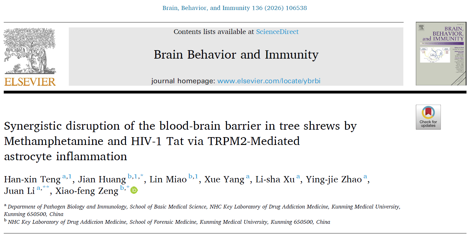Teng HX, Huang J, Miao L, Yang X, Xu LS, Zhao YJ, Li J, Zeng XF. Synergistic disruption of the blood-brain barrier in tree shrews by Methamphetamine and HIV-1 Tat via TRPM2-Mediated astrocyte inflammation. Brain behavior and immunity. 2026, 136: 106538.