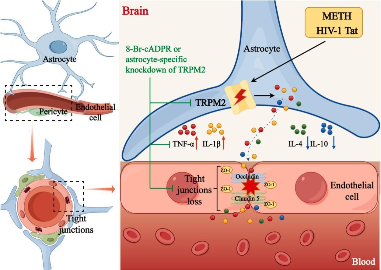 甲基苯丙胺滥用与HIV感染常并发并存,二者均可通过血脑屏障进入中枢神经系统发挥神经毒性,但其协同损伤血脑屏障的具体机制尚不明确。该研究利用树鼩动物模型及内皮细胞-星形胶质细胞共培养体外模型,揭示甲基苯丙胺与HIV-1 Tat蛋白可通过协同激活星形胶质细胞上的TRPM2离子通道,诱发星形胶质细胞介导的神经炎症反应,进而导致血脑屏障破坏,并诱发树鼩刻板行为和焦虑样行为。该研究为理解甲基苯丙胺与HIV协同致中枢神经损伤提供了新机制,并提示TRPM2是潜在的干预靶点。