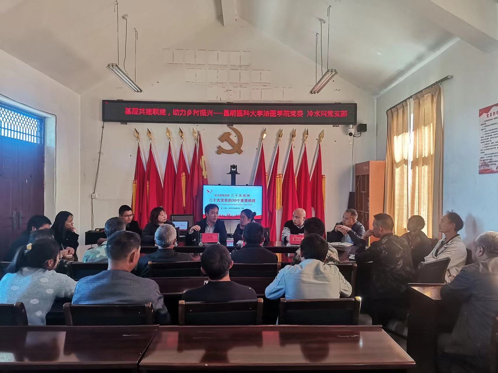 一次座谈会、一次司法鉴定现场服务、一个法治书屋建设、一场普法课、一场党课,三天的行程,满满的收获。座谈会上,象达镇党委、人大、司法所、坝头社区、龙陵三中相关负责同志和坝头社区冷水河党支部书记同志先后发言。双方就党委和支部联建共建工作进行了分析、研判,明确了方向和措施,并就普法教育、基层工作、法治服务进行深入探讨;围绕“党建+法治+乡村振兴”的主题进行充分交流,期望“振乡村、干实事、出新绩”的目标开出法治之花。