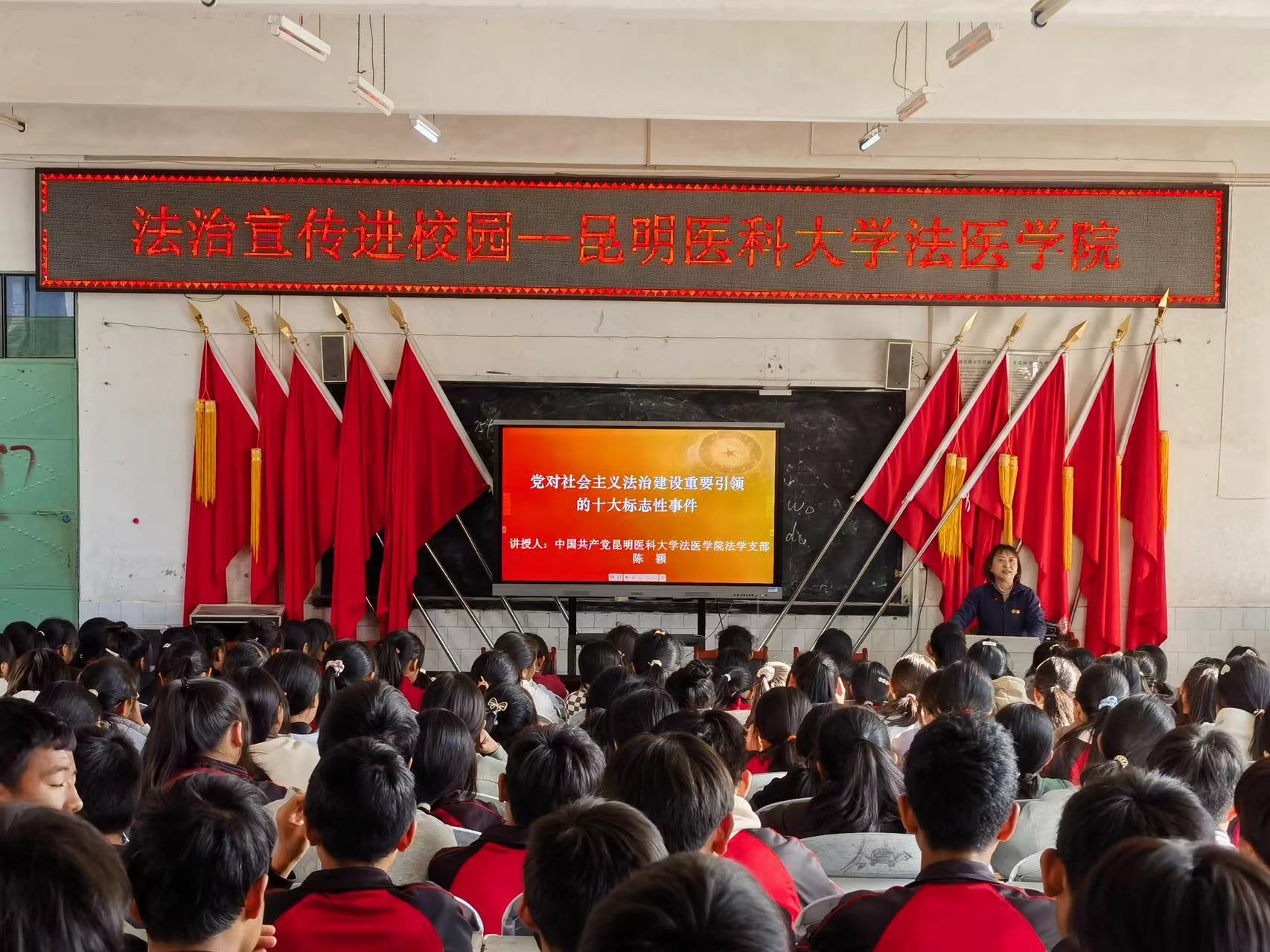 在龙陵县第三中学,法学党支部书记陈颖副教授为300余名师生讲授《党对社会主义法治建设重要引领的十大标志性事件》的普法课,学习宣传贯彻党的二十大精神和习近平法治思想,教育同学们做尊法学法守法用法的好公民。