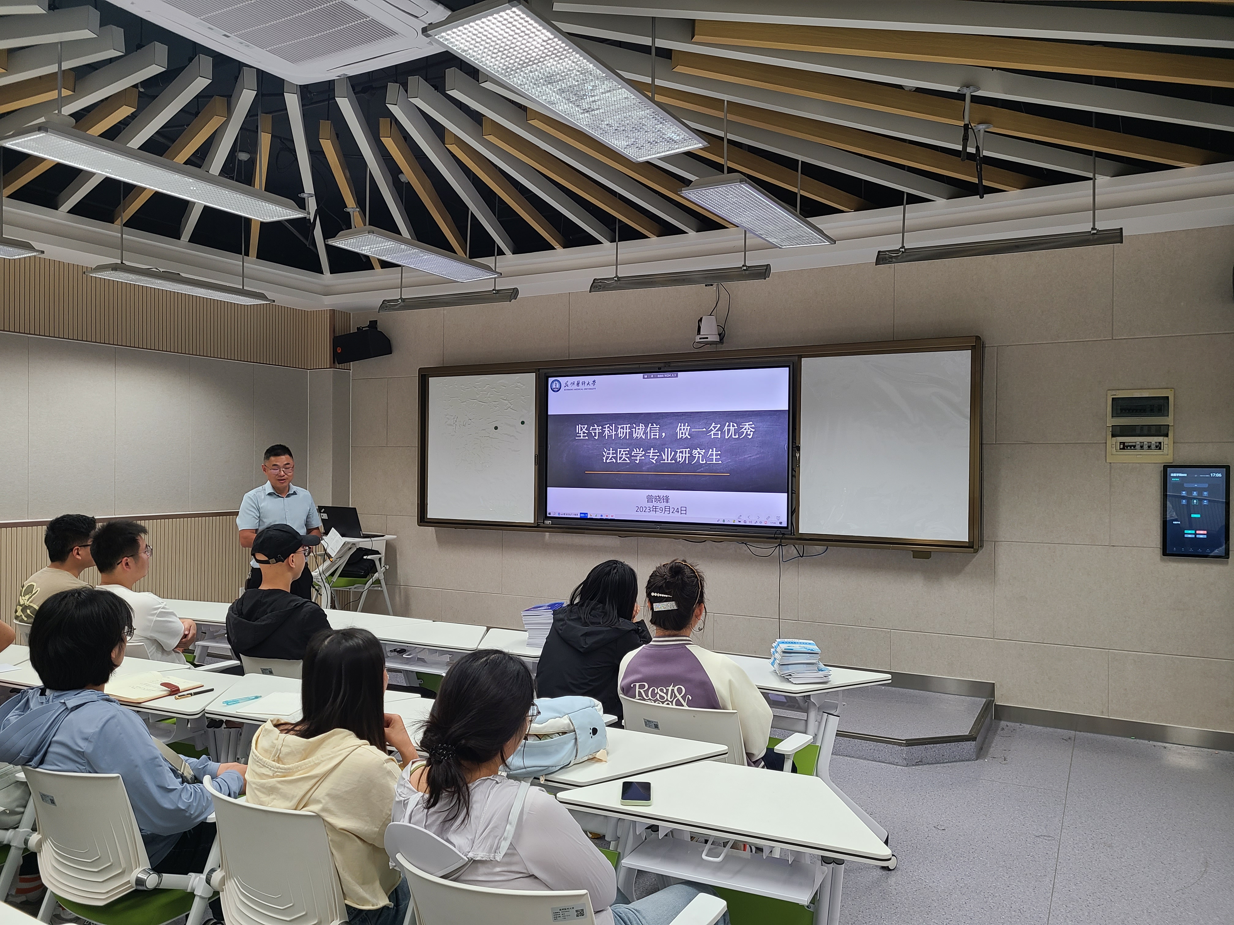 法医学院党委委员、副院长曾晓锋同志为研究生们进行了以《坚守科研诚信,做一名优秀法医学专业研究生》为主题的诚信专题教育。他详细介绍了学术不端行为的常见类型,通过介绍学术不端的具体行为向同学们说明学术不端造成的严重后果。结合法医学院研究生培养的实际情况,曾晓锋强调,研究生在学习中必须按照学术规范开展课题研究,教导同学们要始终保持对学术研究的敬畏心,恪守学术道德底线,坚决抵制学术不端行为,勉励大家努力学习奋进,创先争优,争做拔尖创新人才。