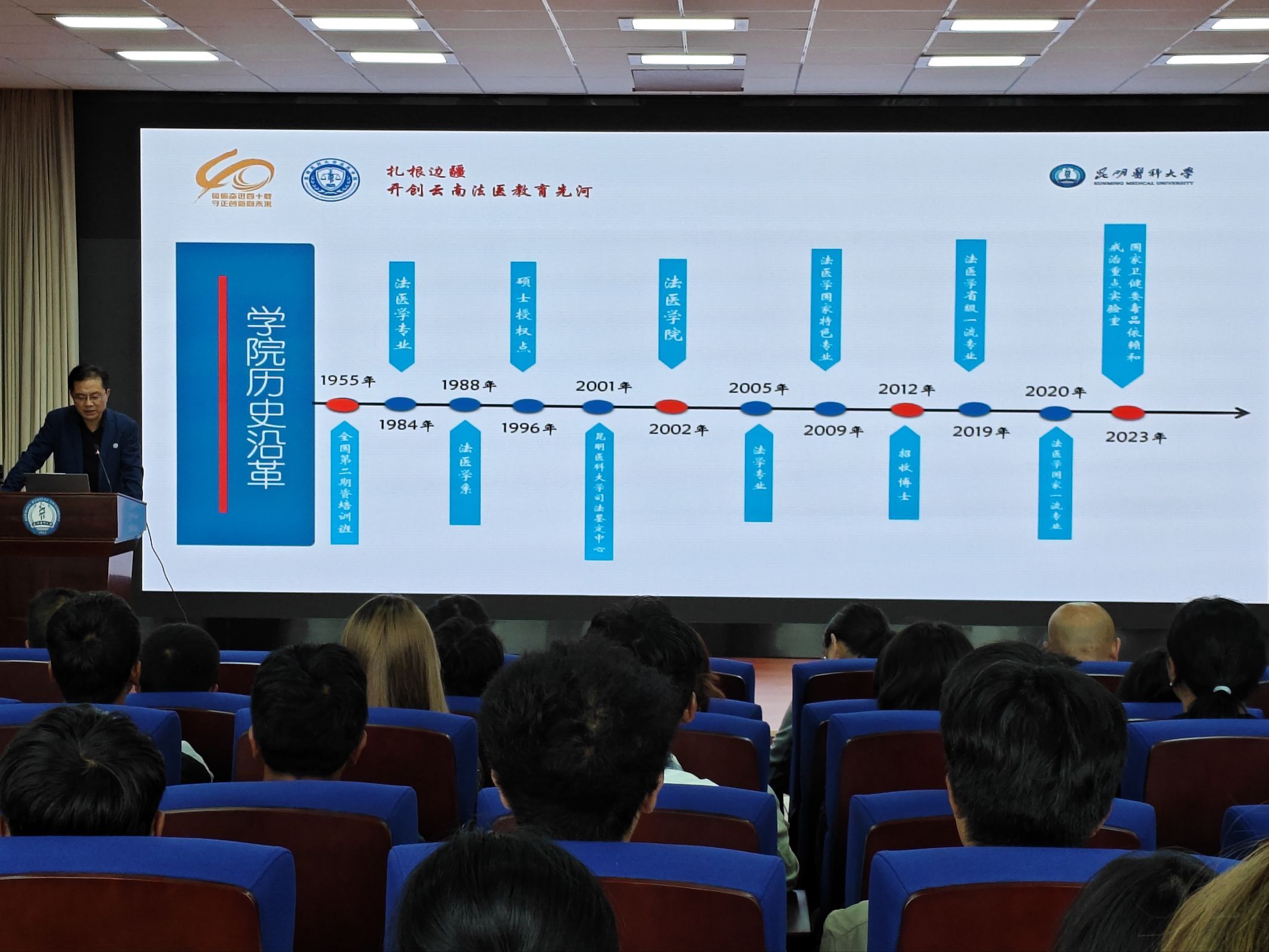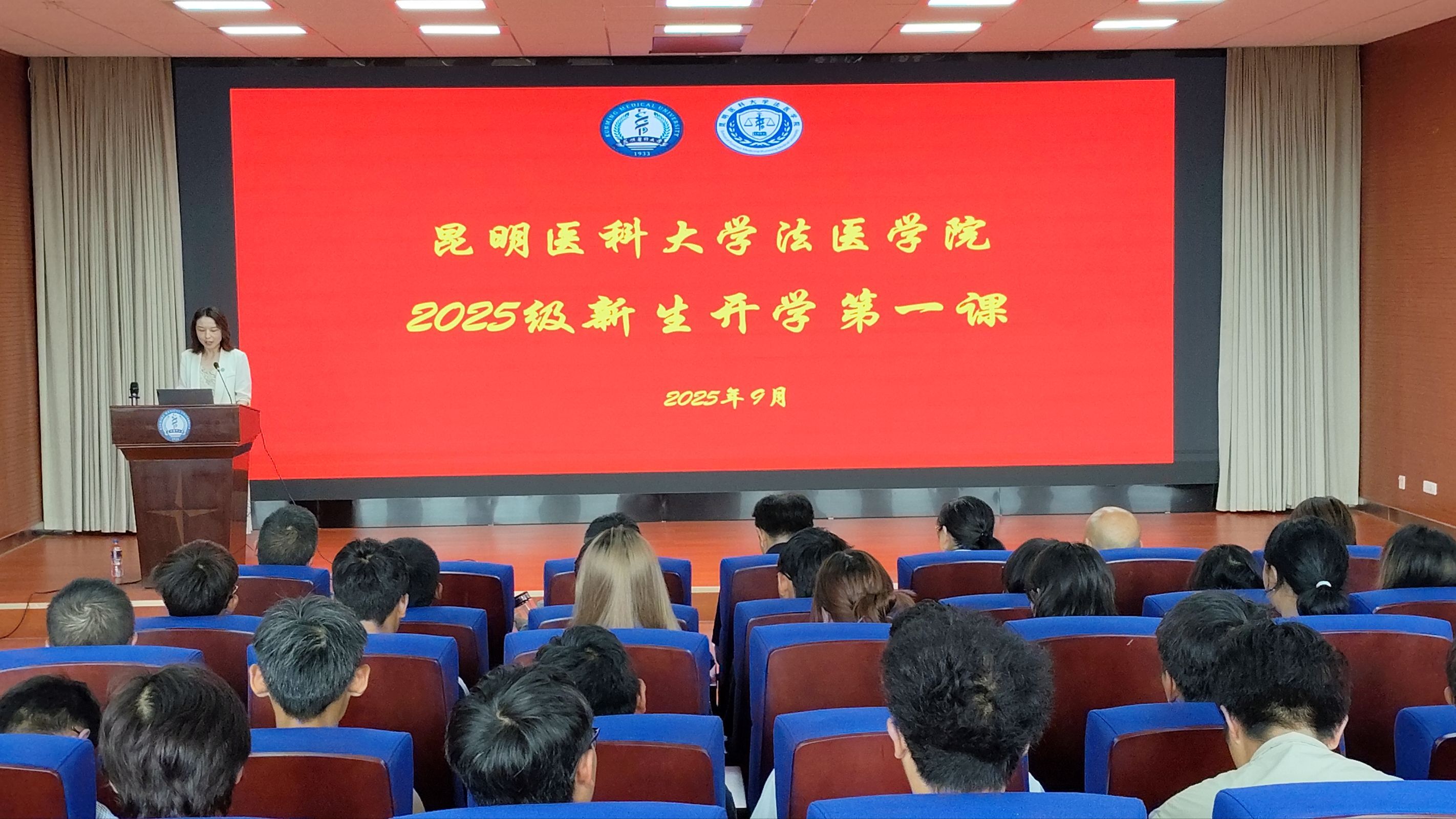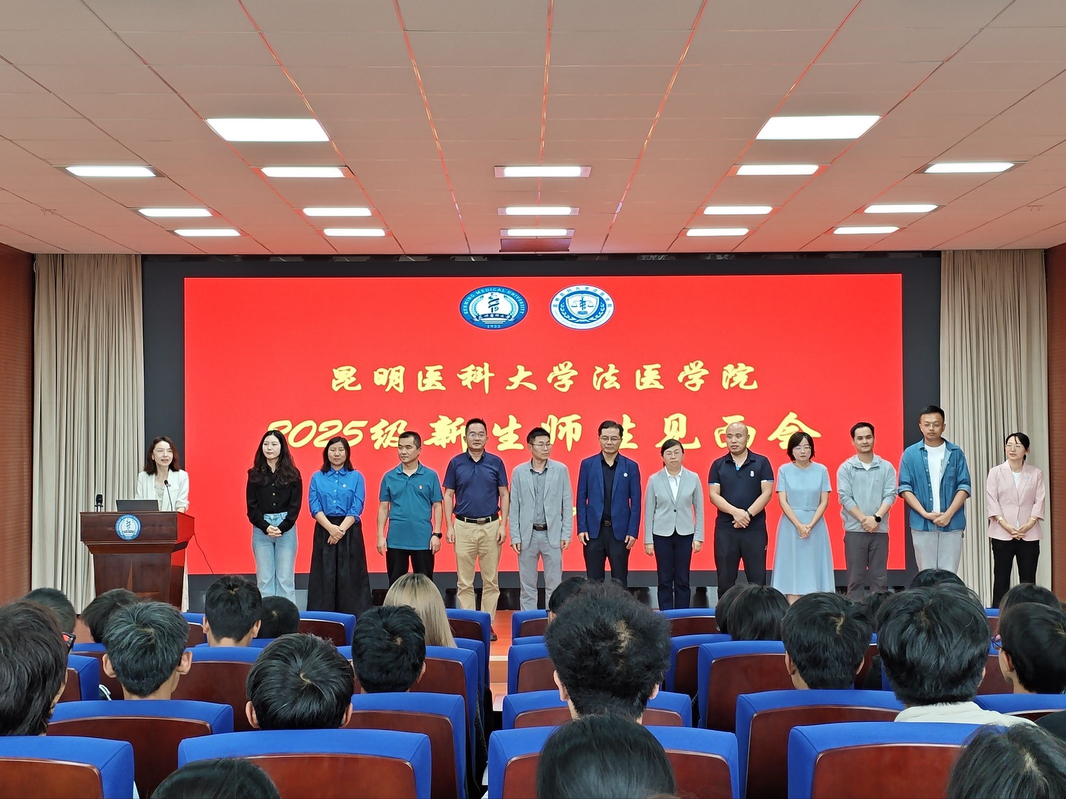 2025年9月12日,法医学院在模拟法庭举行2025级新生见面会暨“开学第一课”。学院党政领导、各办公室负责人、系主任,以及新生辅导员、班主任和新生依次见面,并为全体2025级新生授予院徽。