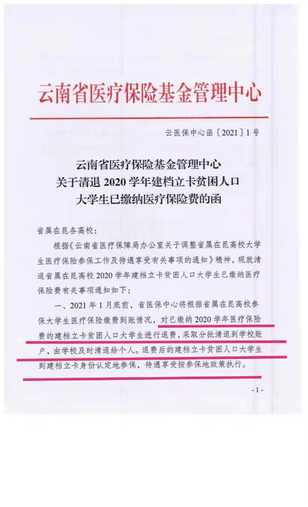 1、现根据文件及通知要求从2021年起,省属在昆高校大学生待遇享受从学年调整为自然年度,待遇享受时间调整为1月1日至12月31日。省属在昆高校大学生若属于建档立卡贫困人口的,在建档立卡贫困人口身份认定地参保,不在高校参保。2021年1月底前,省医保中心将对已缴纳2020学年医疗保险费的建档立卡贫困学生进行退费,由学校及时清退给个人。退费后的建档立卡贫困学生到建档立卡身份认定地参保,待遇享受按参保地政策执行。