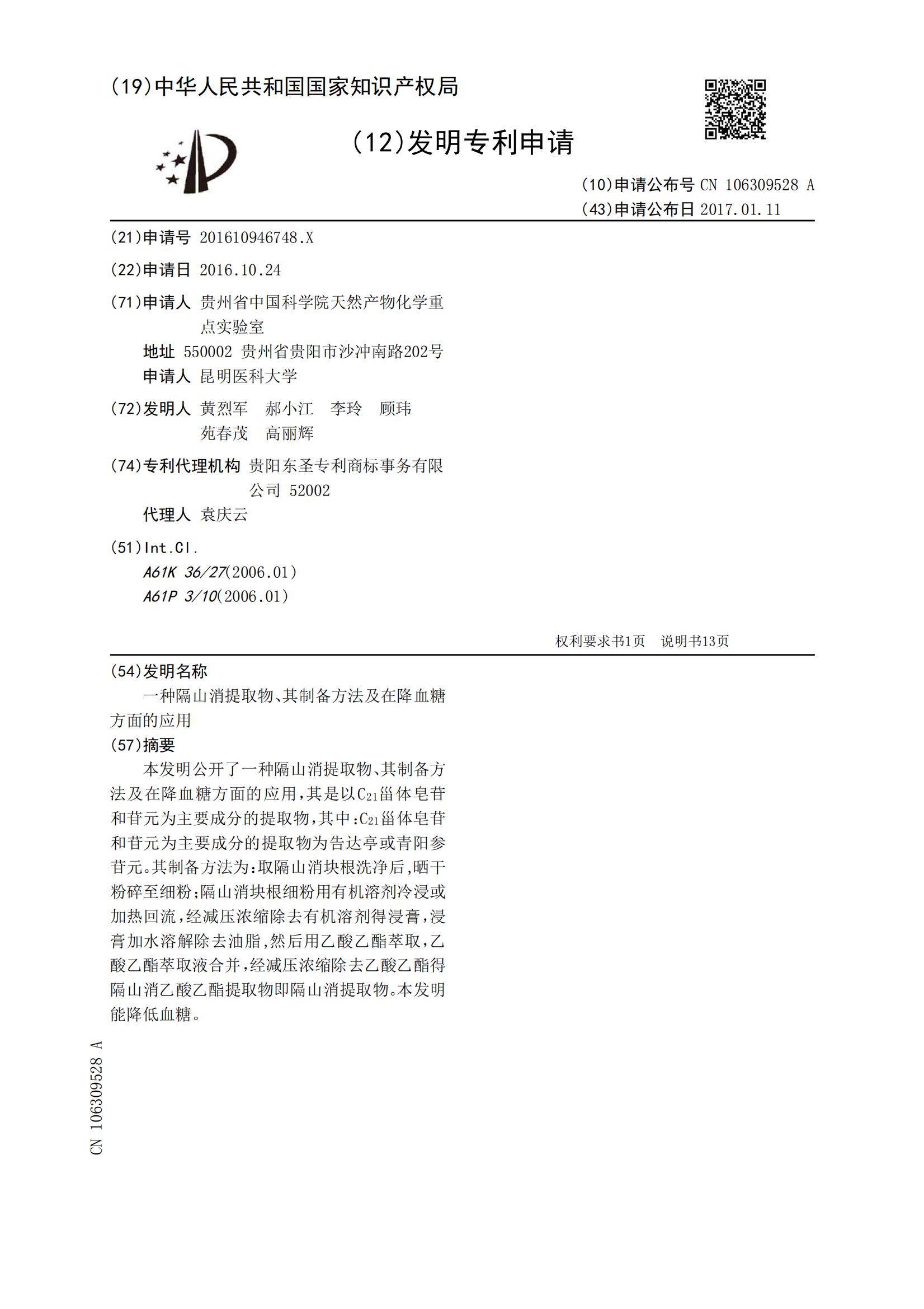 一种隔山消提取物、其制备方法及在降血糖方面的应用