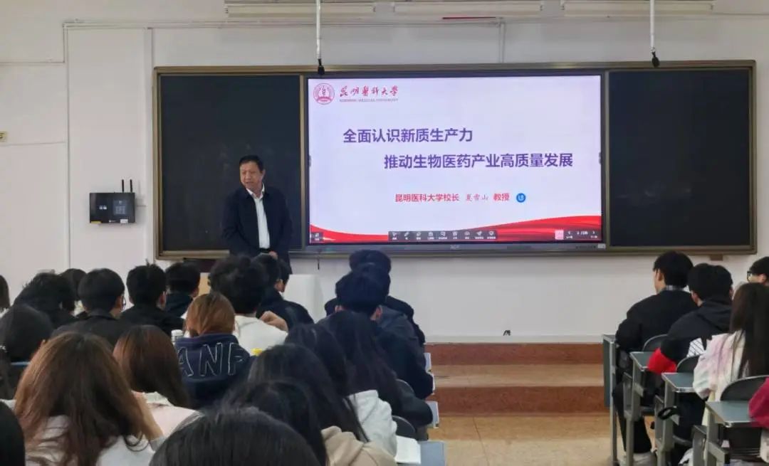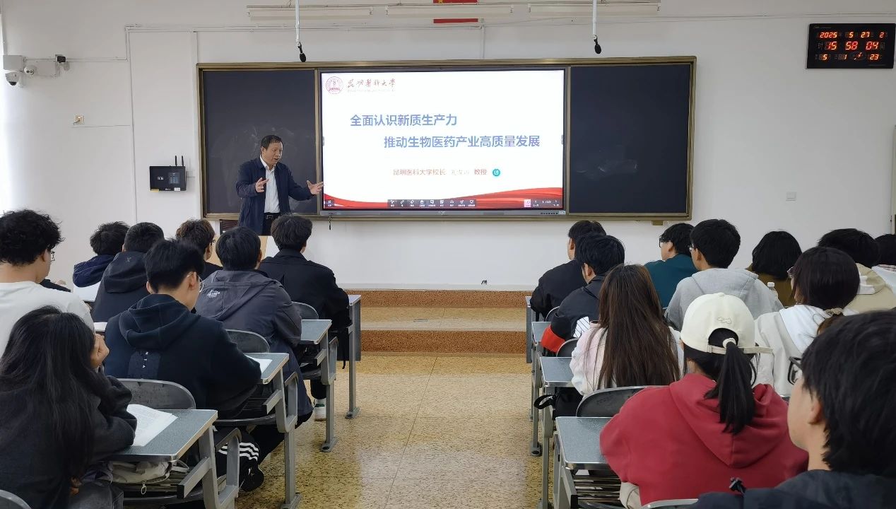 5月27日下午,学校校长夏雪山走进2024级护理学一大班“习近平新时代中国特色社会主义思想概论”课堂,讲授“全面认识新质生产力 推动生物医药产业高质量发展”的专题思政课。