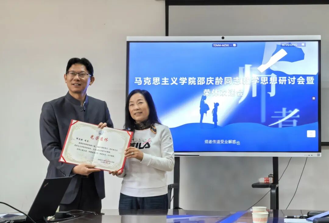 2025年10月31日,我院在209会议室为今年退休的邵庆龄老师举行了一场教学思想研讨会暨荣休欢送会。学院书记院长徐庆生、副书记和晶、副院长王砚蒙和全院无课教师参加。会议由教研室主任胡颖主持。