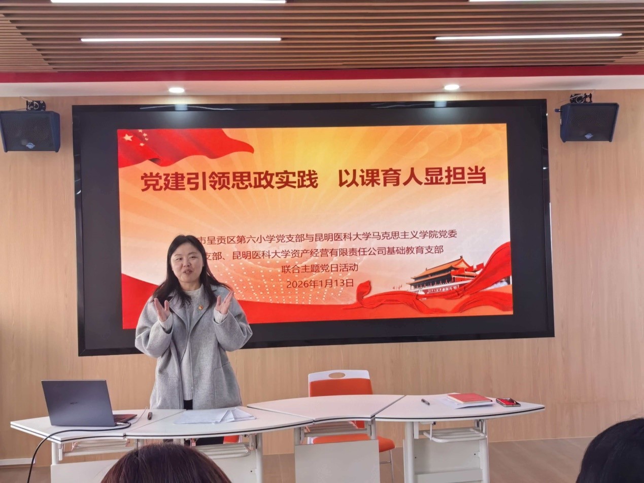 为深化党建与思政教育融合,推动大中小学思政课一体化建设,2026年1月13日下午,昆明市呈贡区第六小学党支部与Beat365唯一官方网站马克思主义学院党委六支部和Beat365唯一官方网站资产经营有限责任公司基础教育支部在昆医附小党建活动室联合开展“党建引领思政实践 以课育人显担当”主题党日活动。三个党支部全体党员共同参加,入党积极分子、入党申请人和昆医大附小校外辅导员(昆医大马院教师)马娇玲列席,昆医大马院党委副书记和晶指导,活动由呈贡六小党支部书记王珺主持。