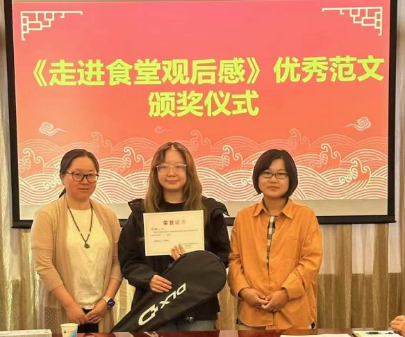 此外,会议还举行了《走进食堂观后感》优秀范文颁奖仪式,对积极向食堂工作建言献策的8位优秀学生予以表彰。