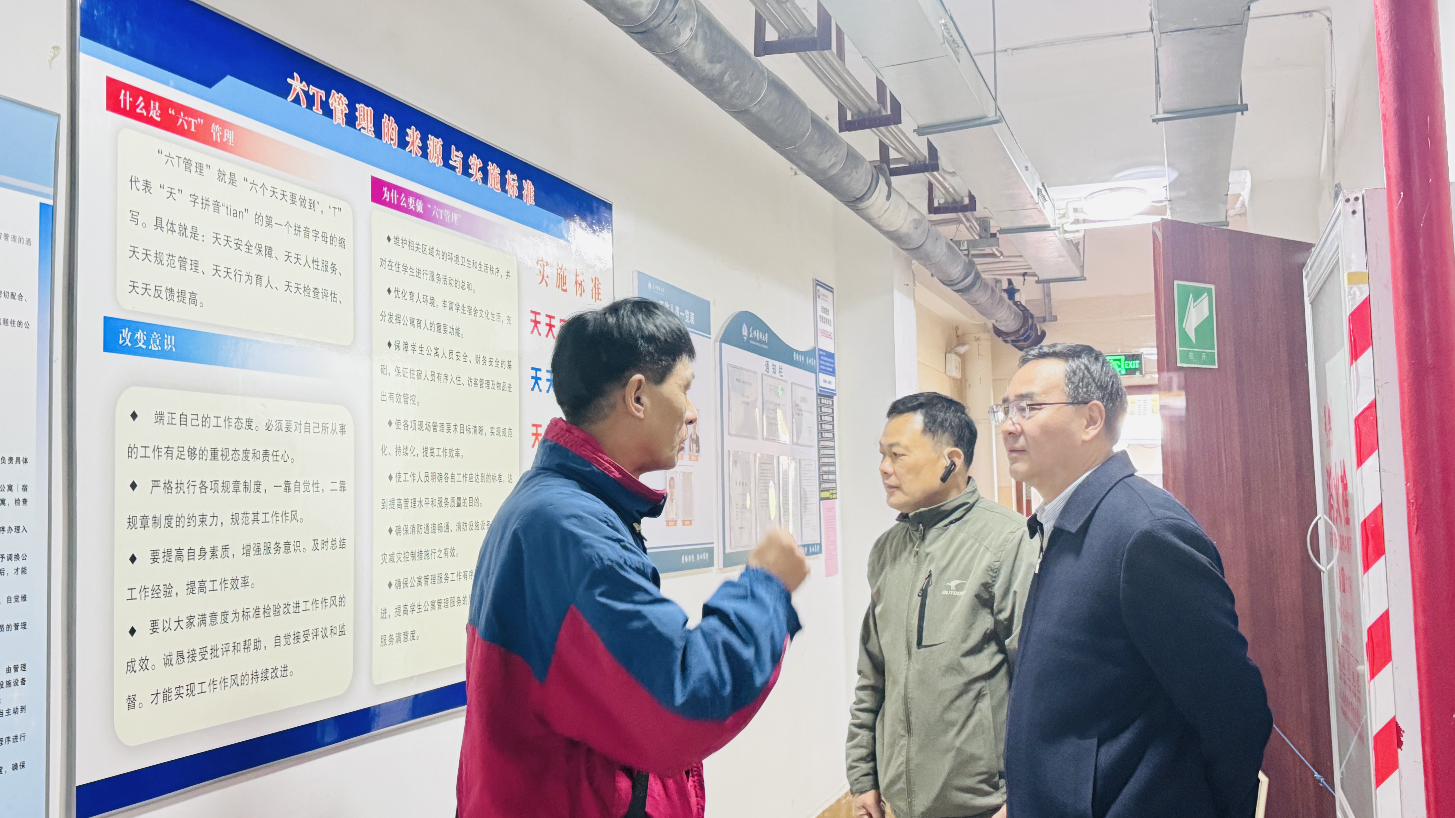 在平政校区公寓、高新校区公寓,姚树明听取了学生公寓在两校区的工作情况、人员安排、部门成本、各岗位工作内容的情况,详细询问了员工工作及人员思想状况,并到驻校各单位了解对后勤保障的意见建议。
