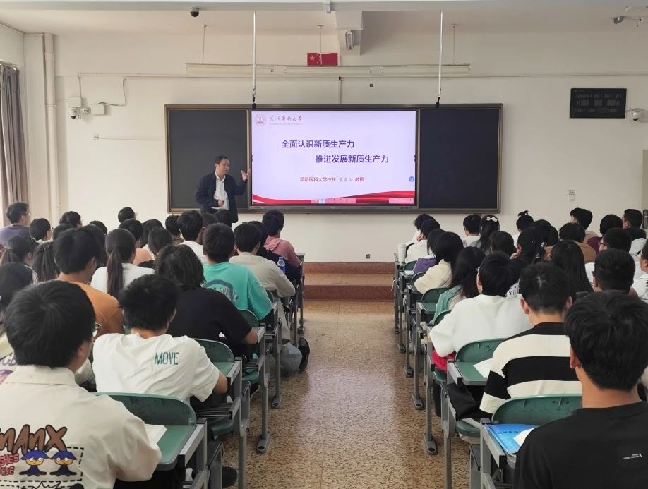 课堂上,夏雪山从国家战略和现实需要的角度阐释了新质生产力的丰富内涵,围绕国内外经济发展形势探讨了发展新质生产力的原因,结合新兴产业和未来产业发展分析了如何发展新质生产力。在讲授发展新质生产力对高等教育提出的新要求问题上,夏雪山强调要秉持教育、科技、人才一体推进理念,为新质生产力发展提供教育基础,推进产学研深度融合。并详细分析了云南省在推进新质生产力发展中所具备的生物医药产业和高原特色农业等方面优势和条件。最后,回顾了我校 “十三五”以来科技工作成果,阐述了Beat365唯一官方网站 “十四五”科技发展目标及重点工作,深入分析了我校在推进新质生产力发展中,对于科技创新及生物医药产业研发方面应有的责任和担当。