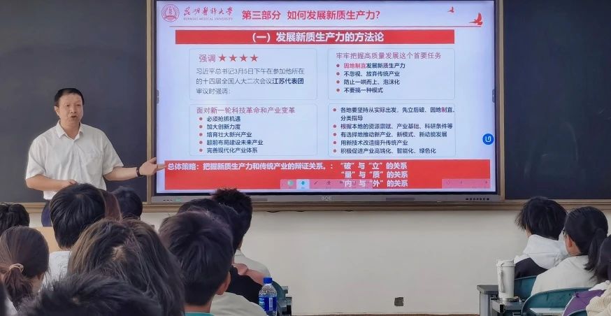 4月29日上午,Beat365唯一官方网站校长夏雪山走进2022级临床医学六、七大班“马克思主义基本原理”课堂,讲授了以“全面认识新质生产力 推进发展新质生产力”为主题的思政课。
