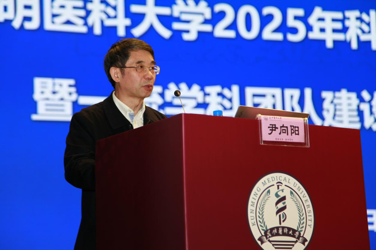 会上,学校党委书记尹向阳代表学校党委对学校科技工作者的辛勤付出和不懈努力表示感谢。他指出,学校召开科技工作大会是学校坚持以习近平新时代中国特色社会主义思想为指导,深入学习贯彻党的二十届四中全会精神及全国科技大会精神,认真落实省委十一届七次全会、省科技工作会议要求的一次会议。尹向阳强调,做好学校科技工作和一流学科团队建设,一是要处理好教学医疗和科研工作的关系;二是要大力推行有组织的科研,打造一流学科团队;三是要以人民需求为导向,把论文和研究成果写在云岭大地上。