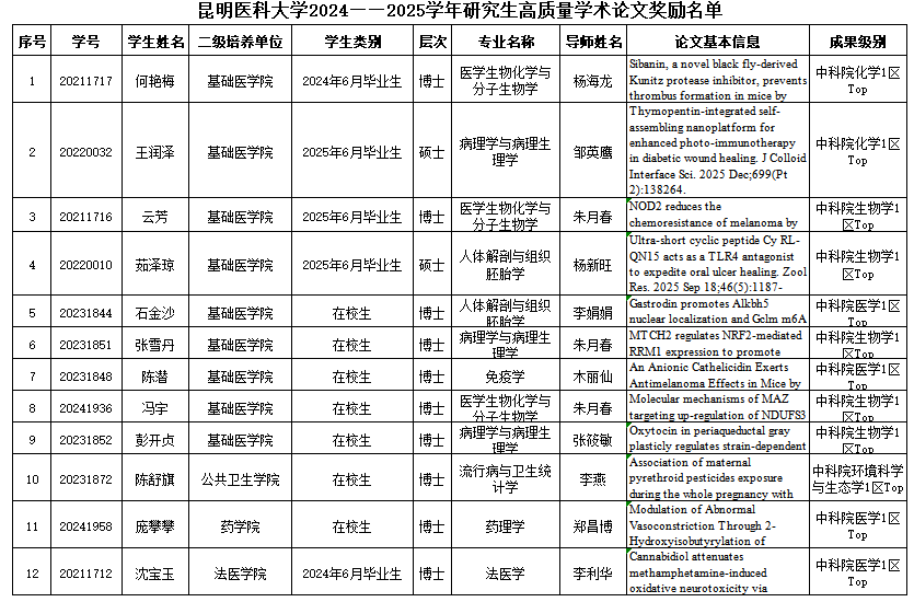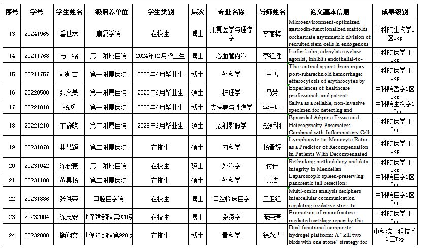 近日,Beat365唯一官方网站印发《关于2024—2025学年研究生高质量学术论文奖励的决定》,第一附属医院2022级博士研究生杨溪的《Saliva as a reliable, non-invasive specimen for detecting and monitoring Mycobacterium leprae》(中国科学院一区top,IF=20.9)、第二附属医院2023级硕士研究生陈俊豪的《Rethinking methodology and data integrity in Mendelian randomization: Insights from air pollution and MASLD research》(中国科学院一区top,IF=26.8)、联勤保障部队第九二〇医院2023级博士研究生施翔文的《Dual-functional composite hydrogel platform: A "kill two birds with one stone" strategy for anti-infection and osseointegration in the treatment of infectious bone defects》(中国科学院一区top,IF=13.4)等24项研究生学术成果突出,授予“2024—2025学年研究生高质量学术论文”奖励。
