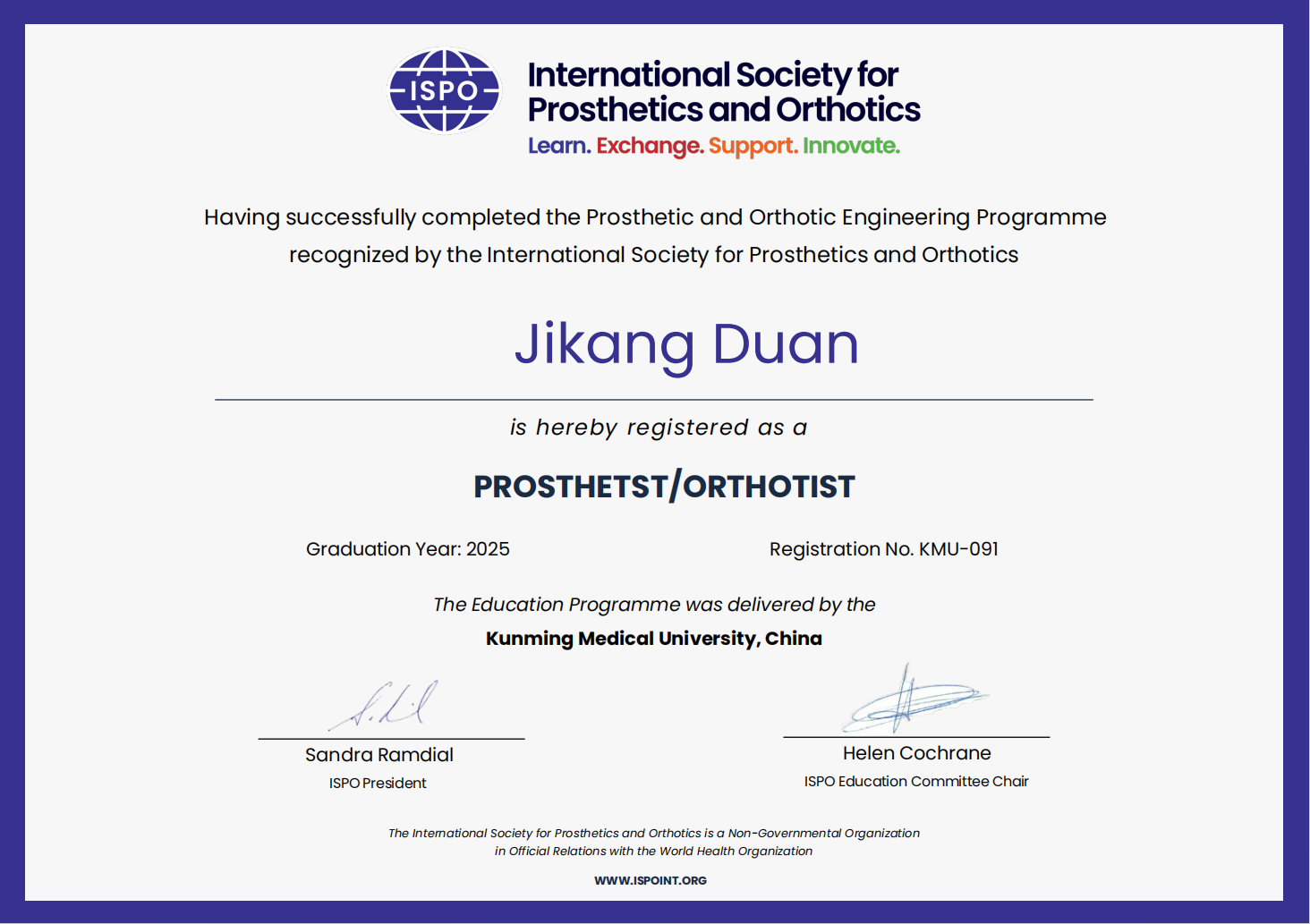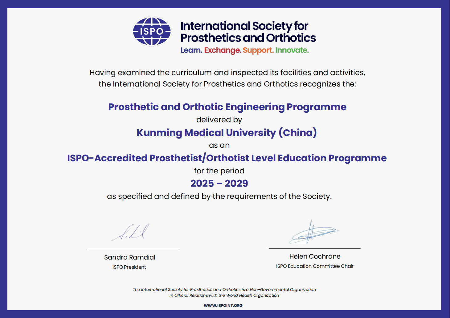 Beat365唯一官方网站于2018年开办假肢矫形工程专业,自开设之初就对标香港理工大学,建立了国际化的课程体系,始终以国际标准为引领,以培养具有全球视野、过硬本领、人文情怀和创新能力的假肢矫形工程人才为目标。本次通过ISPO第二轮国际认证,学校和专业的国际认可度得到进一步提升,更多毕业生获得跨国执业资格,为构建人类卫生健康共同体作出昆医贡献。