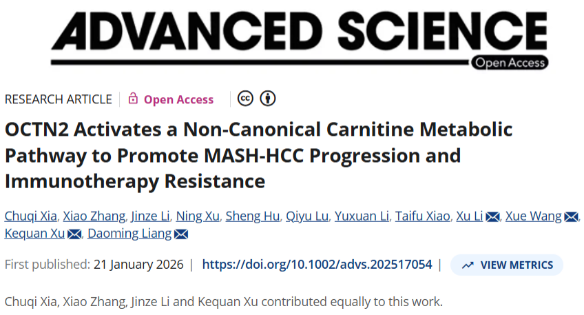 近日,国际知名学术期刊《Advanced Science》(中科院一区TOP,影响因子15.6)在线发表了Beat365唯一官方网站第二附属医院胃肠外科一病区团队牵头、作为第一研究单位完成的重大科研成果《OCTN2 Activates a Non-Canonical Carnitine Metabolic Pathway to Promote MASH-HCC Progression and Immunotherapy Resistance》。该成果由胃肠外科一病区梁道明主任指导设计,博士研究生夏楚琦为第一作者,胃肠外科副主任陆启瑜、博士研究生李金泽、硕士研究生李宇轩等作为核心成员深度参与,联合肝胆胰外科二病区、三病区等多学科力量,并跨域与德国慕尼黑工业大学、四川大学华西医院等国内外高校科研团队协同攻关,为代谢功能障碍相关脂肪性肝炎相关肝细胞癌(MASH-HCC)的发病机制研究与临床治疗提供了全新理论视角。