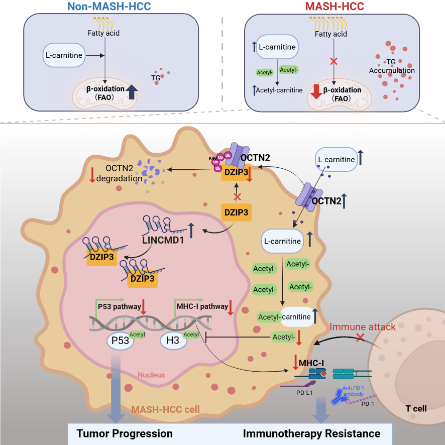 据悉,该研究聚焦MASH-HCC临床管理中的核心难题——缺乏明确代谢驱动机制、免疫治疗疗效不佳且预测靶点匮乏,系统揭示了肿瘤在代谢功能受限背景下维持进展并逃避免疫治疗的关键调控路径。研究明确了OCTN2相关肉碱代谢异常在MASH-HCC发生发展及免疫治疗耐受中的决定性作用,从代谢适应角度,阐明了该亚型肝癌对现有治疗反应有限的生物学基础,为精准识别高风险人群、开发新型治疗策略提供了重要理论依据和潜在干预靶点。