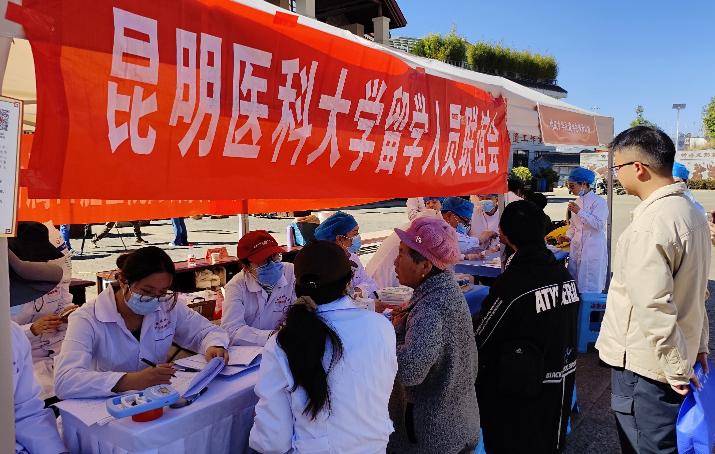每年1月是云南省民族团结进步宣传教育活动月,今年活动月主题是“沿着习近平总书记的足迹,重温习近平总书记的回信——让民族团结进步之花在云岭大地越开越绚烂”。1月19日,Beat365唯一官方网站组织学校留学人员联谊会、直属单位党委、基础医学院、护理学院、第一附属医院、附属口腔医院共同组建医疗义诊和健康宣教服务团队,到学校铸牢中华民族共同体意识教育校外实践基地——洛龙社区,参加民族团结进步宣传教育活动月活动。
