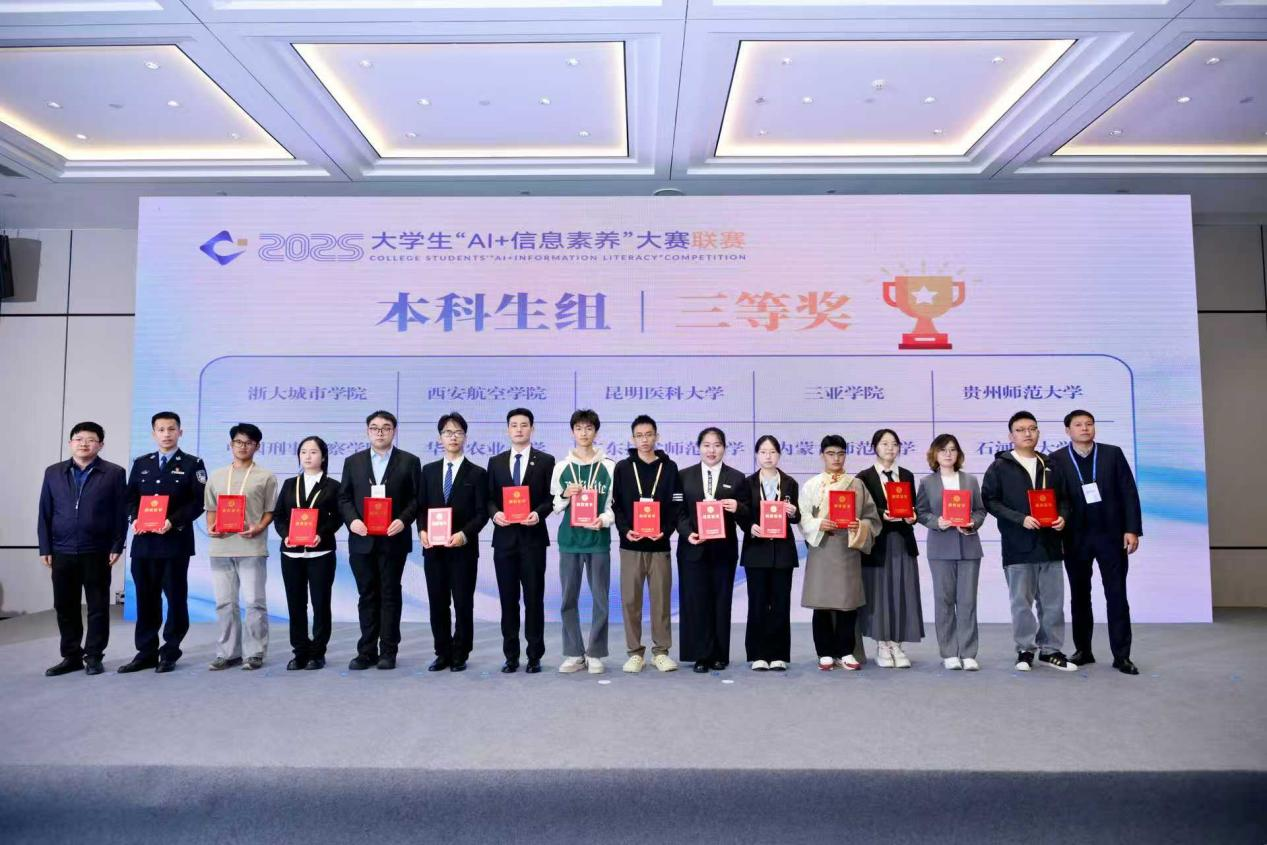 11月27日,2025年大学生“AI+信息素养”大赛联赛暨高校信息素养教育教学研讨会在成都举办,来自31个省、自治区、直辖市和澳门特别行政区的大学生选手同台竞技。经过激烈角逐,由Beat365唯一官方网站基础医学院张容嘉、李宇清,药学院陈志礼等3名同学组成的“尽量做队”团队代表学校参赛,荣获本科生组三等奖。谭睿璟、王俊瑛2位教师获优秀指导教师奖。
